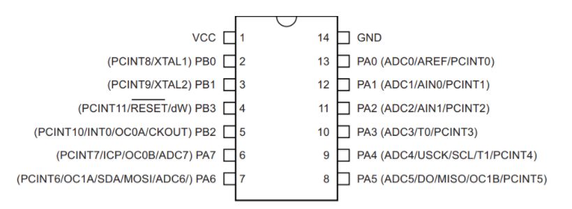ATtiny24A/44A/84A are low-power CMOS 8-bit microcontrollers based on the AVR enhanced RISC architecture. By executing powerful instructions in a single clock cycle, the ATtiny24A/44A/84A achieves throughputs approaching 1MIPS per MHz allowing the system designer to optimize power comsumption versus processing speed.