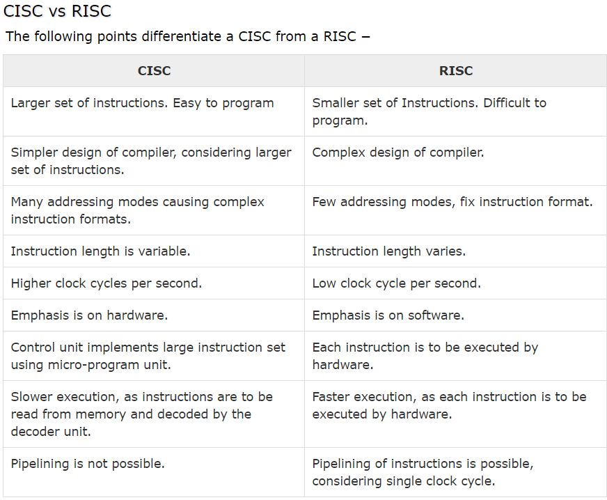 CISC is a Complex Instruction Set Computer. It is a computer that can address a large number of instructions. In the early 1980s, computer designers recommended that computers should use fewer instructions with simple constructs so that they can be executed much faster within the CPU without having to use memory. Such computers are classified as Reduced Instruction Set Computer or RISC.