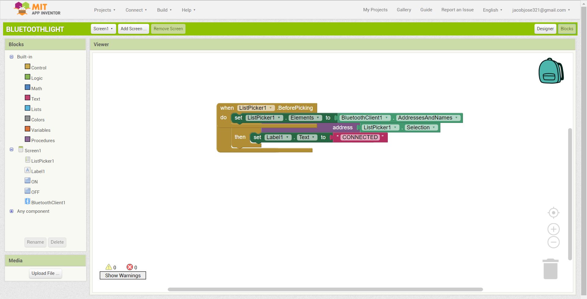 To start using the MIT App Inventor we have to first go to http://ai2.appinventor.mit.edu and login with our gmail account.As mentioned earlier we have two main parts called Designer and Block to start making our app. In our designer part we can speacify the overall outlook of our app. We can determine the color shape and other details of the user interface. In my case I had mainly 3 buttons LIGHTS ON , LIGHTS OFF and CONNECT BLUETOOTH. We can simply drag and drop these buttons and edit the details to our required speacifications. I used Listpicker to list all the bluetooth devices and LIGHT buttons to control them.