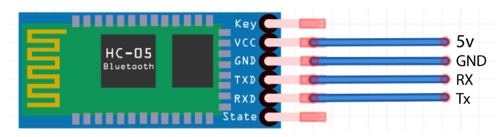 By the above connection setup Connect the VCC the bluetooth module to the 5V supply and GND to GND itslef. While connecting the RX and TX be carefull to connect to connect the RX of the Bluetooth module to the TX of the board or vice versa since the module is not communicating with another transmitter.