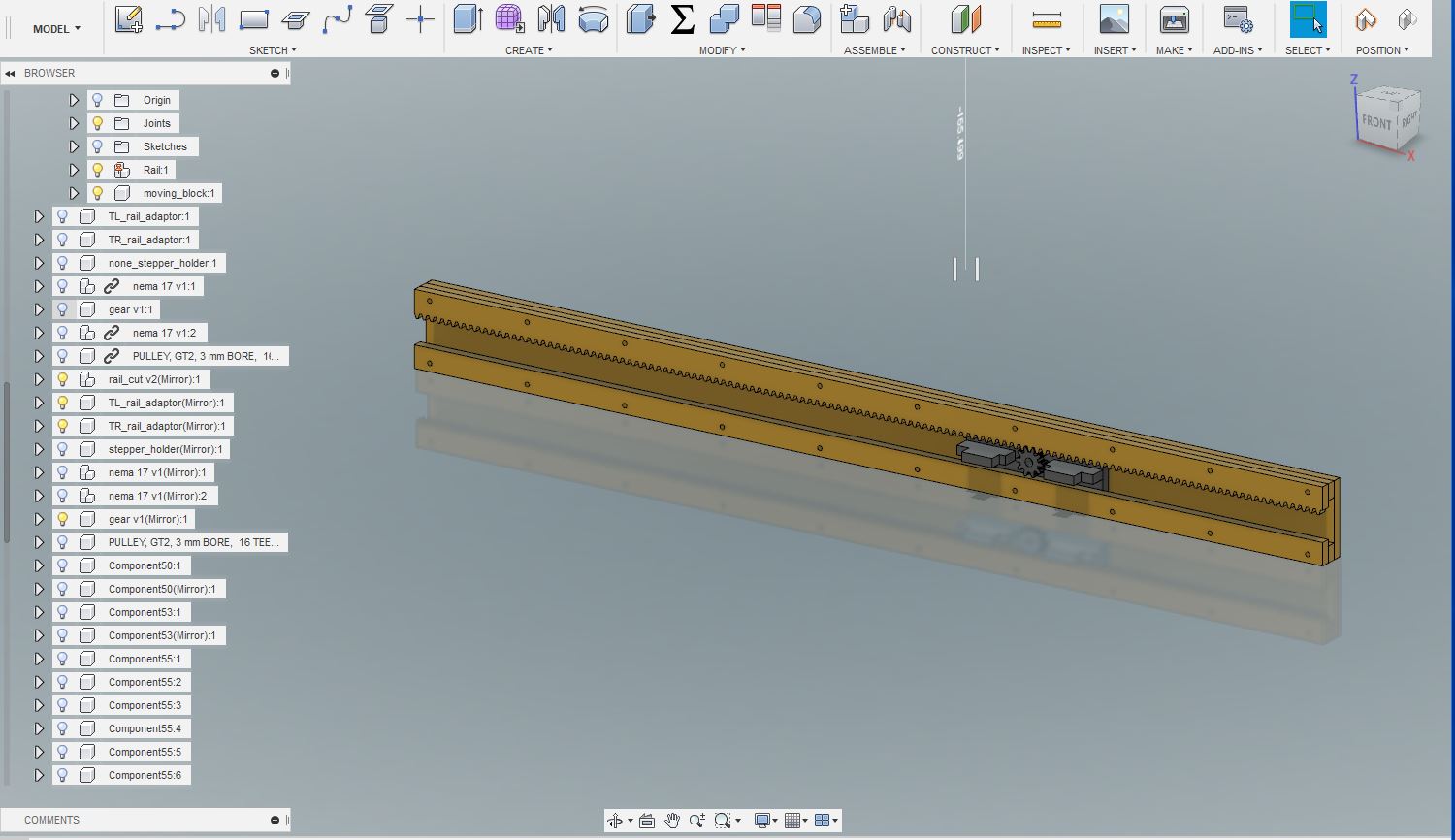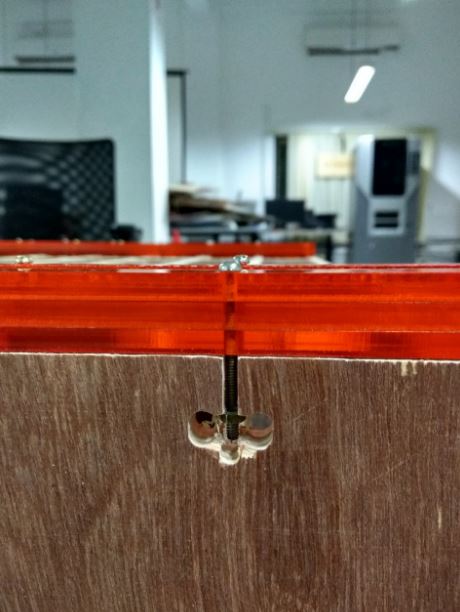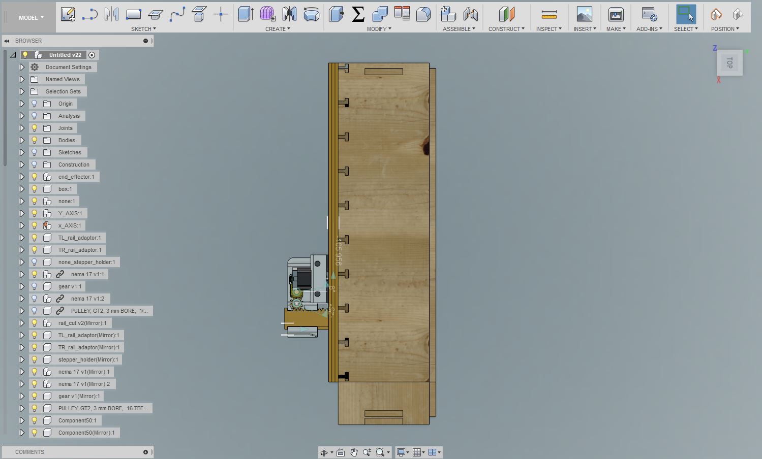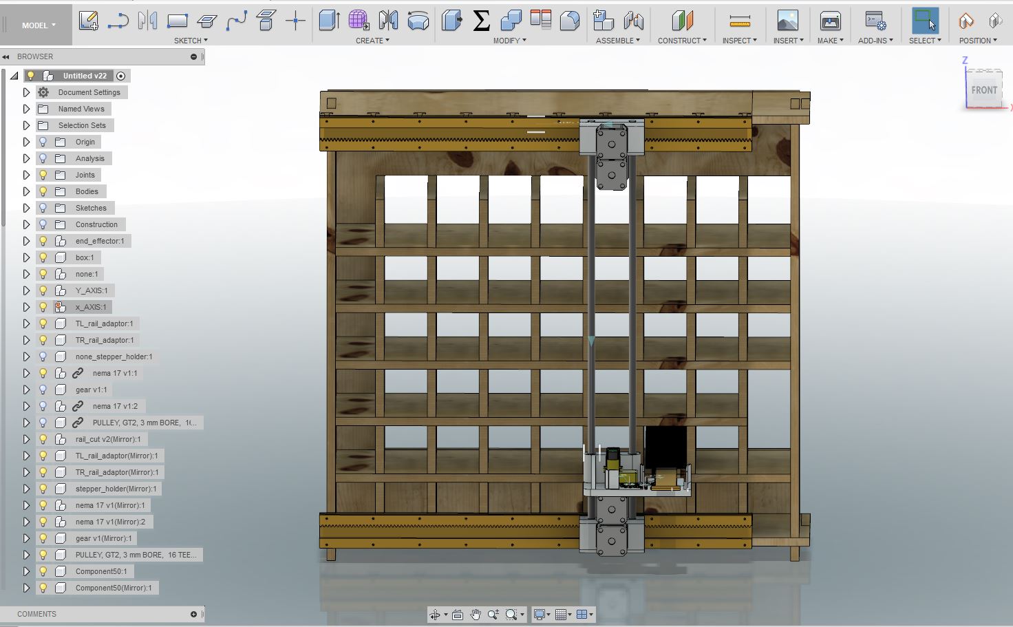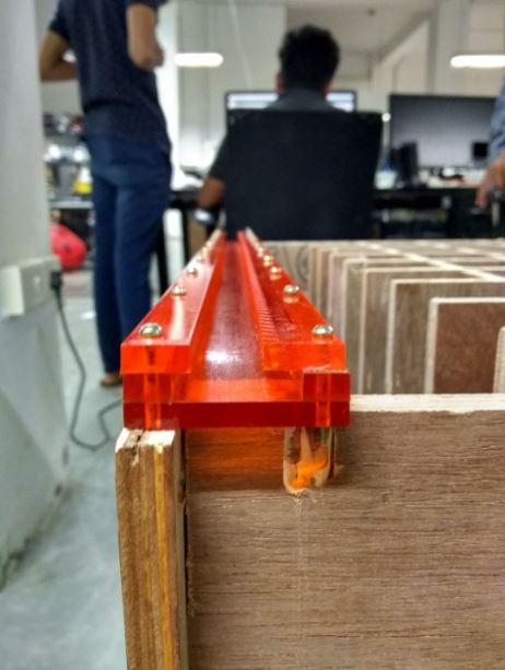 And we came up with a half rail based and half belt driven system intead of a completely belt driven system.The idea was to use maximum components from inventory and we only had a small piece of the timing belt left in our lab. Also, there could be a some vertical force on the belts as well, due to the weight of the end effector module.So we thought to use a rail system for the horizontal movement. Before designing one overselves we first refered many rail systems and mechaniacl systems developed in Fablab.We really liked the Chamfered Rail System and Core[X,Y] system . Chamfered rail system require shopbot to mill the components and was time consuming. So we made a design which could be easily manufactured using laser cutting process.