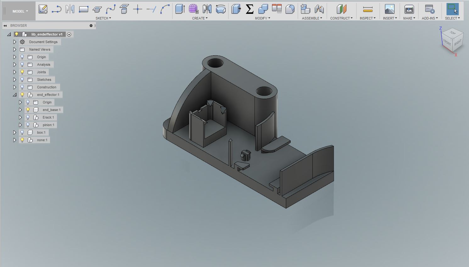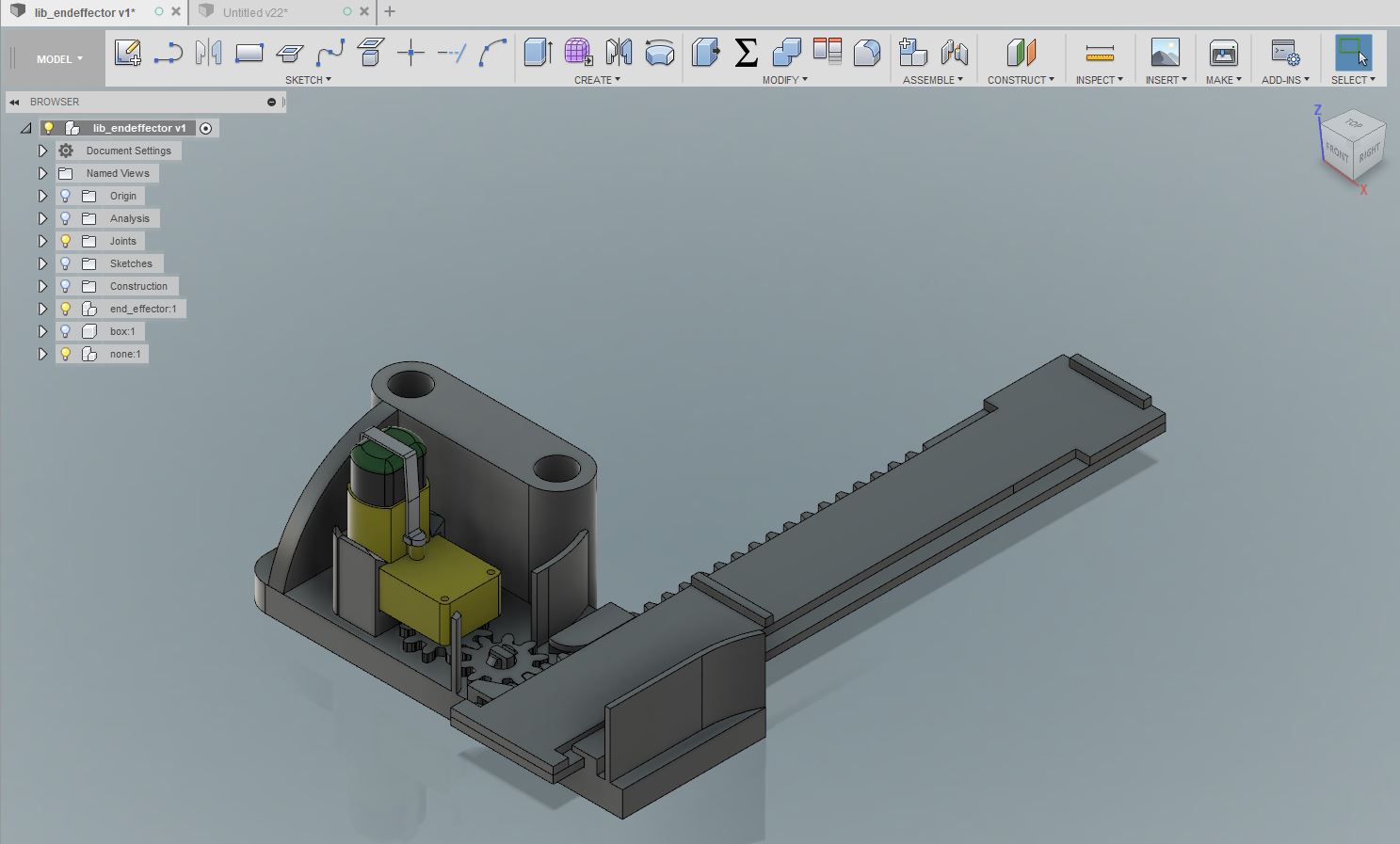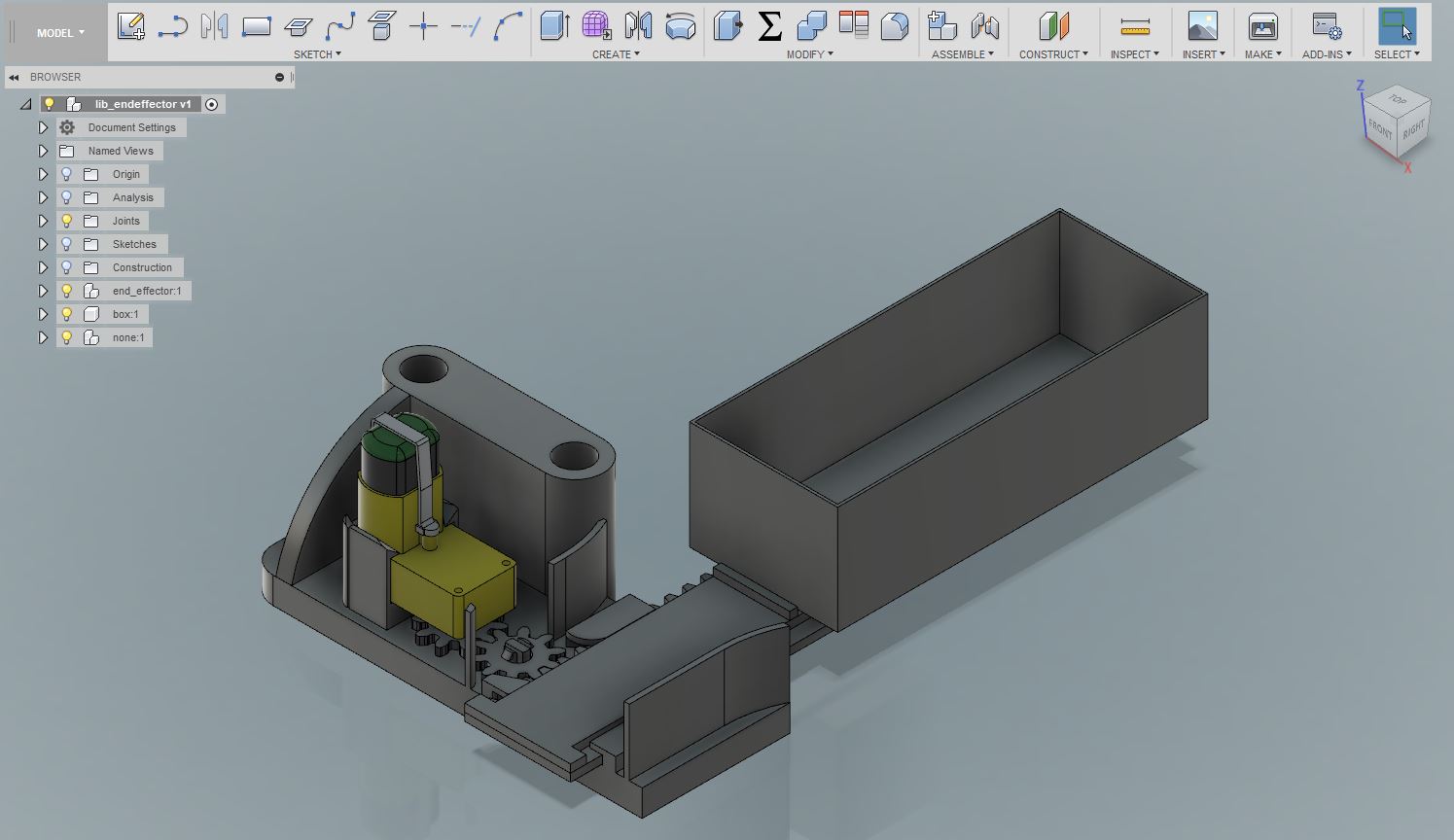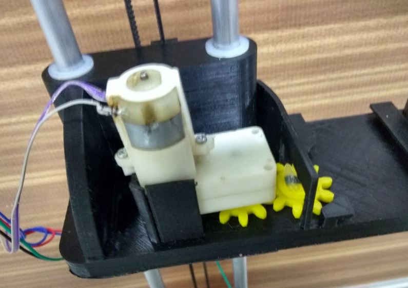 The end effector should have a mechanism within itself to retrieve and supply the components. We designed a simple rack and pinion system for this purpose which could be easily lasercut and could be operated using a simple geared mini motor.This one also holds the provision to attach the timing belts.