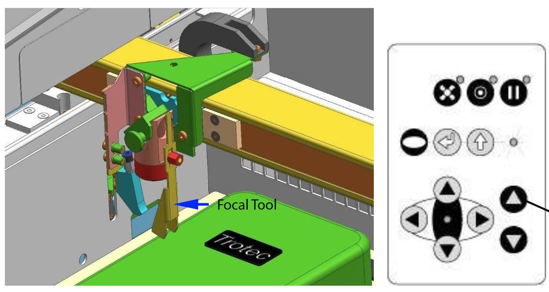 Move the processing head over the material to be engraved by means of the positioning keys X/Y.Hang the focus tool on the external ring of the working head so that the focus tool can move unhindered. Move the working table upwards by pressing the Z positioning key (1). While doing this carefully observe the focus tool.Before the focus tool reaches the work piece, move the working table upwards only very slowly and step by step by briefly tapping the positioning key, until the tool tilts to the side. Now the lens is focused onto the surface of the material (Source: Users maual.)