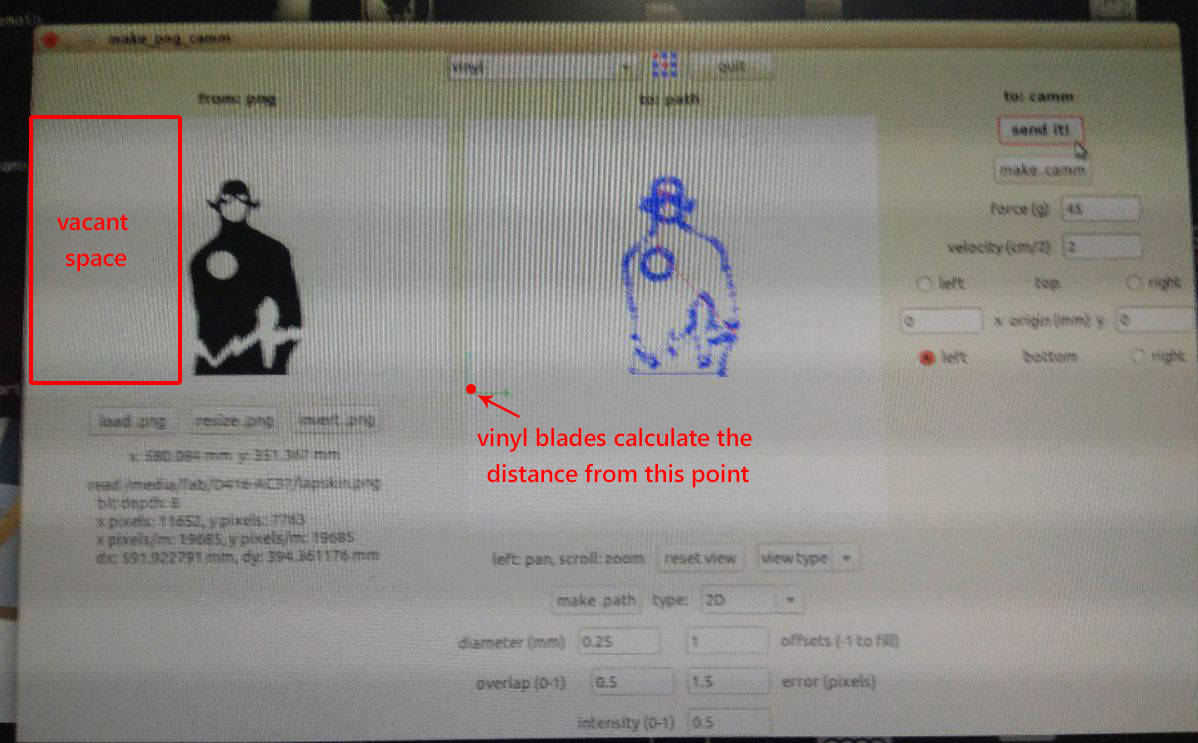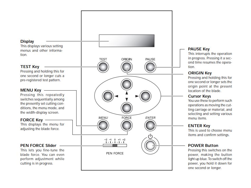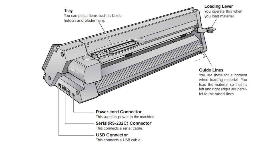 For setting up the vinyl first pull the Loading lever and place the vinyl sheets on to the Grit rollers.Once the vinyl is in place pull forward the Loading lever again to secure the vinyl sheets in postion.Now using the cursor keys in operations panel adjust the position of cutting carriage.Once in the right postion select the piece or roll option and press the enter key. To set the origin press on the origin key for a few seconds.