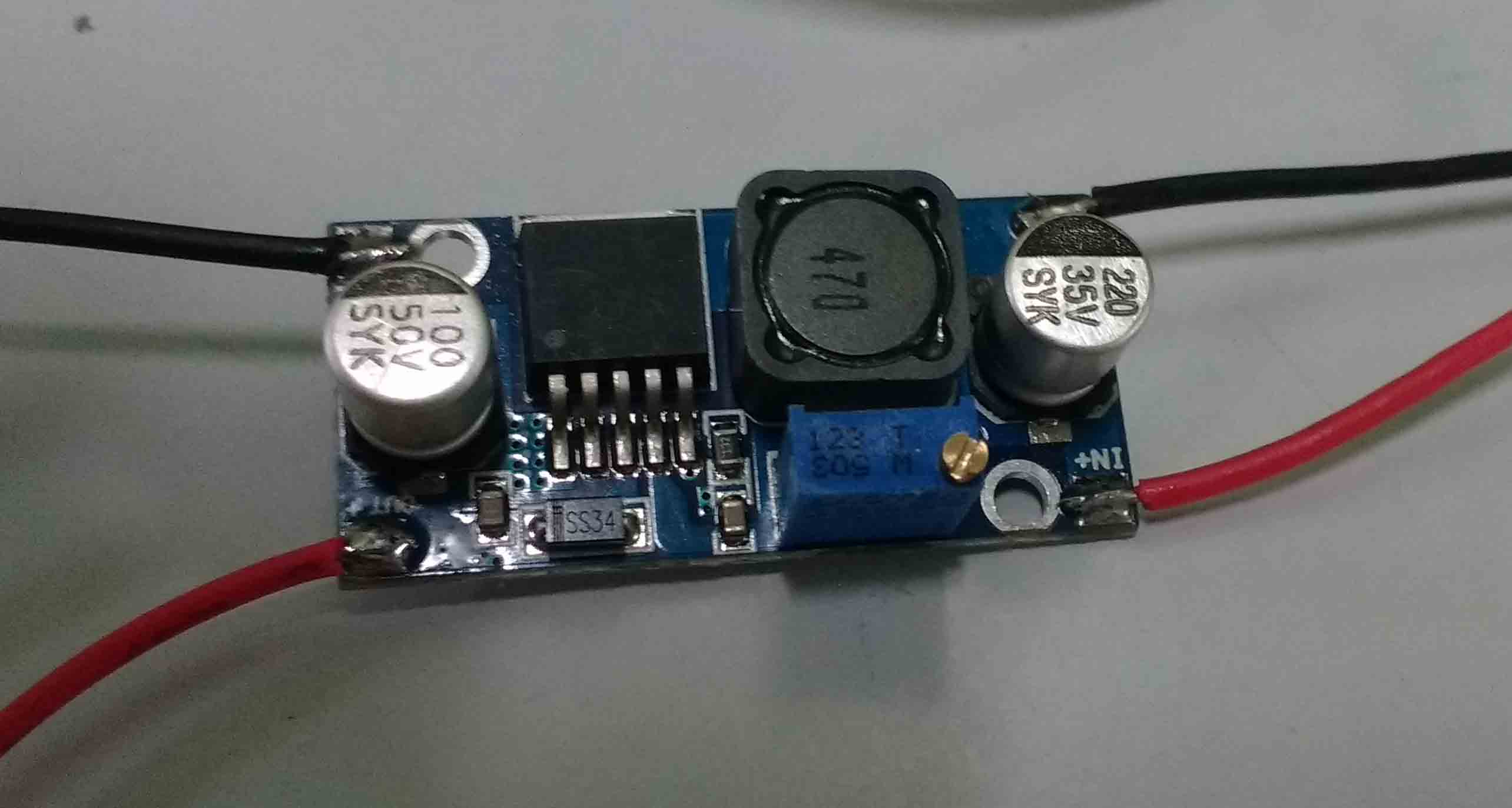 I used tp4056 module for cell charging(5v to 3.7v) and LM2596 DC-DC Buck Converter for bosting the voltage form Li-ion cell's 3.7 volt to 5v.The image shown below is the LM2596 DC-DC Buck Converter module