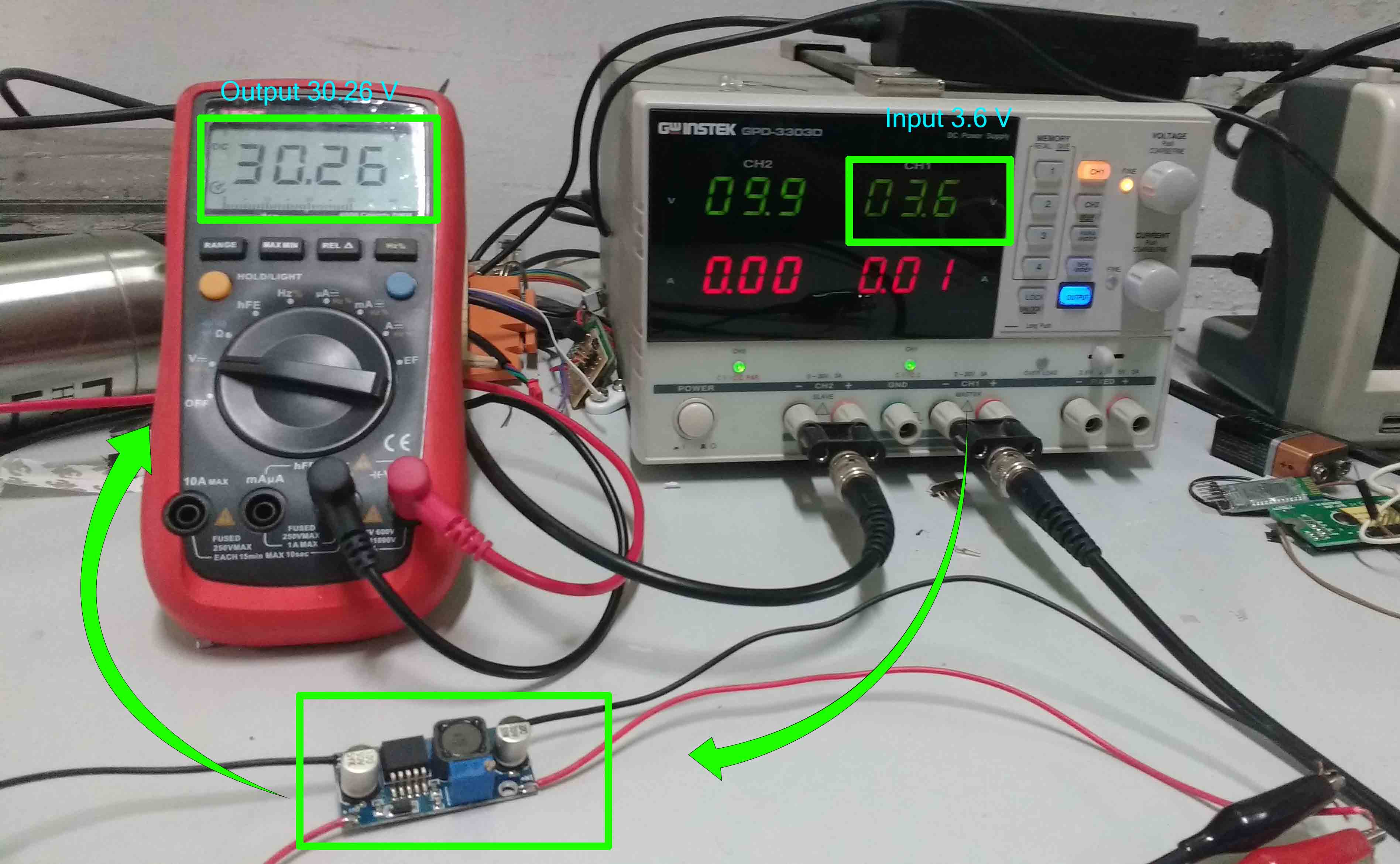 By adjusting the potentio meter on the module we can change the out put voltage of the module. this Youtube video simply explains the working of a boost converter. When I applied 3.6v to the Input I could able to get a maximum readable value of 30.2v from the module .