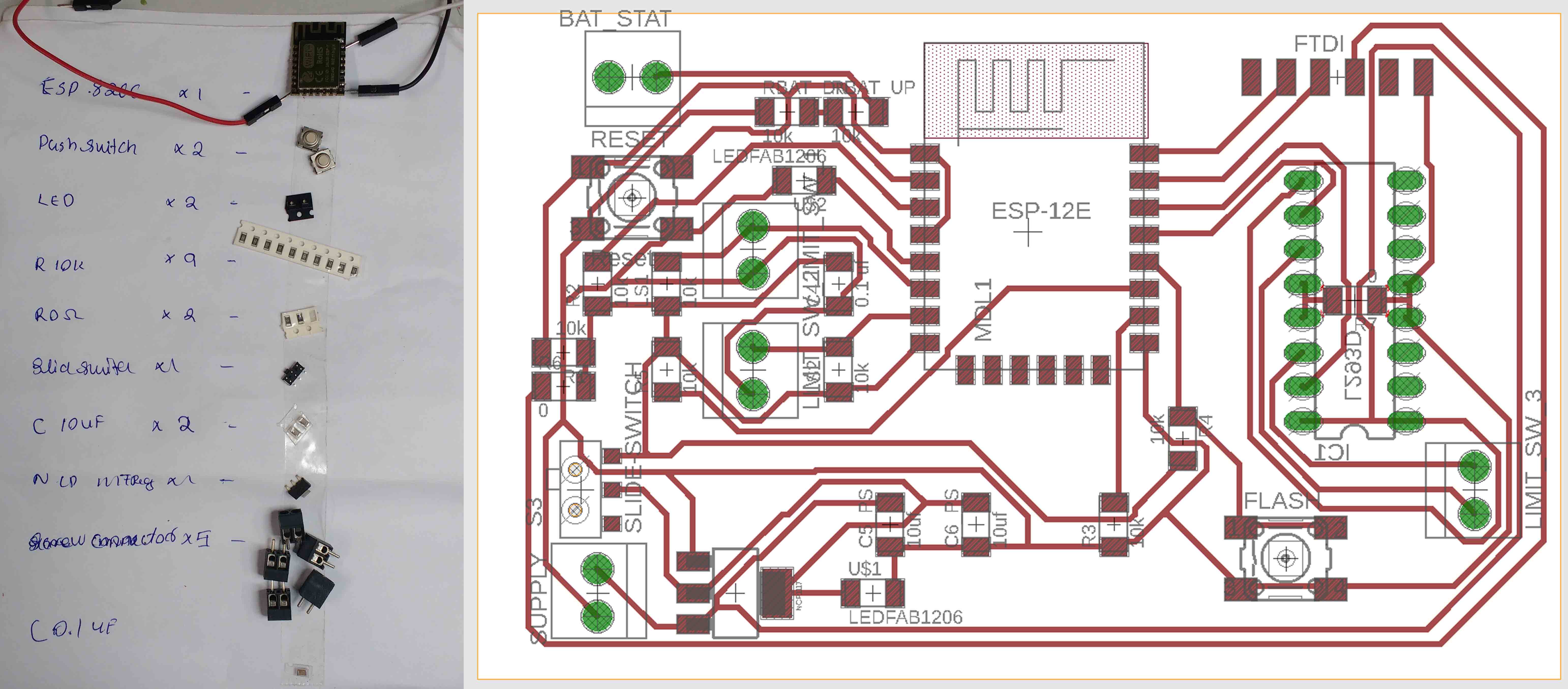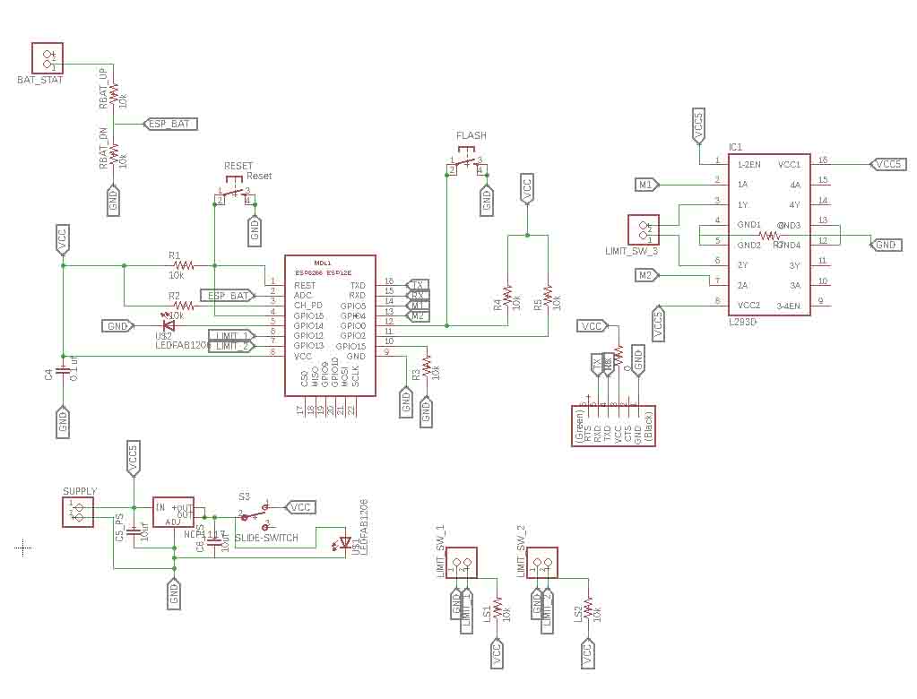 In addition to the motor driver and soc I added a 3.3v regulator ,2 push button each for reset and flash,A potential divider circuit for cell voltage measurement.I added 3 ports 2 for connecting 2 limit switches and a ftdi port.
