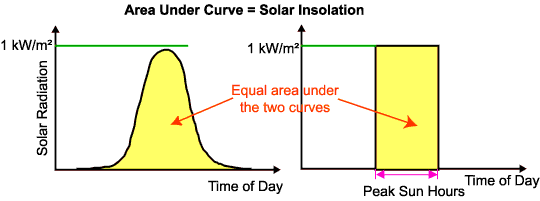 The figure below shows the avalibility of solar energy in a day . Fom that we can say that the total solar energy could be converted can be written as = peek sun hours x peek output.