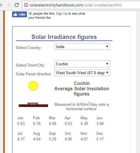 This is the availibility of solar power in our city kochi. The maximum solar energy receving in a horizontally placed panel of area 1 m2 in a day in june is 3.96 .