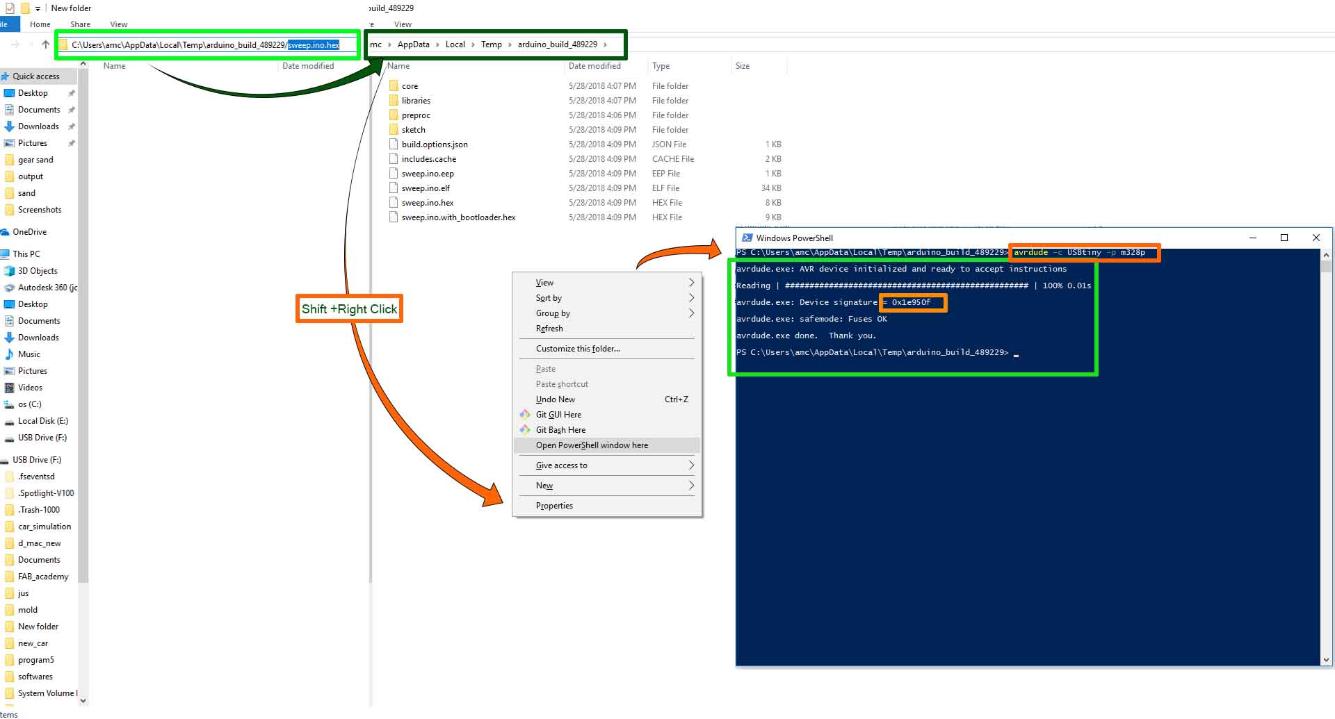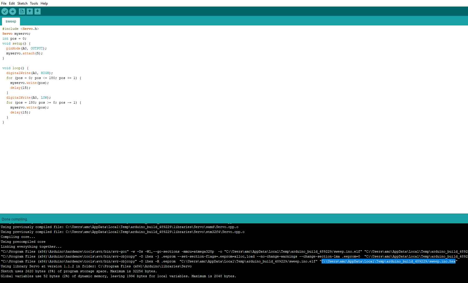 There will be something like "C:\Users\amc\AppData\Local\Temp\arduino_build_489229/sweep.ino.hex"
