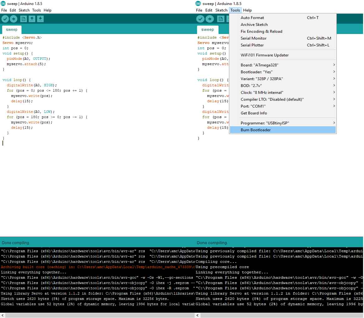 And select appropriate clock source,Processor and programmer. Burn the bootloader using tools -> Burn bootloader