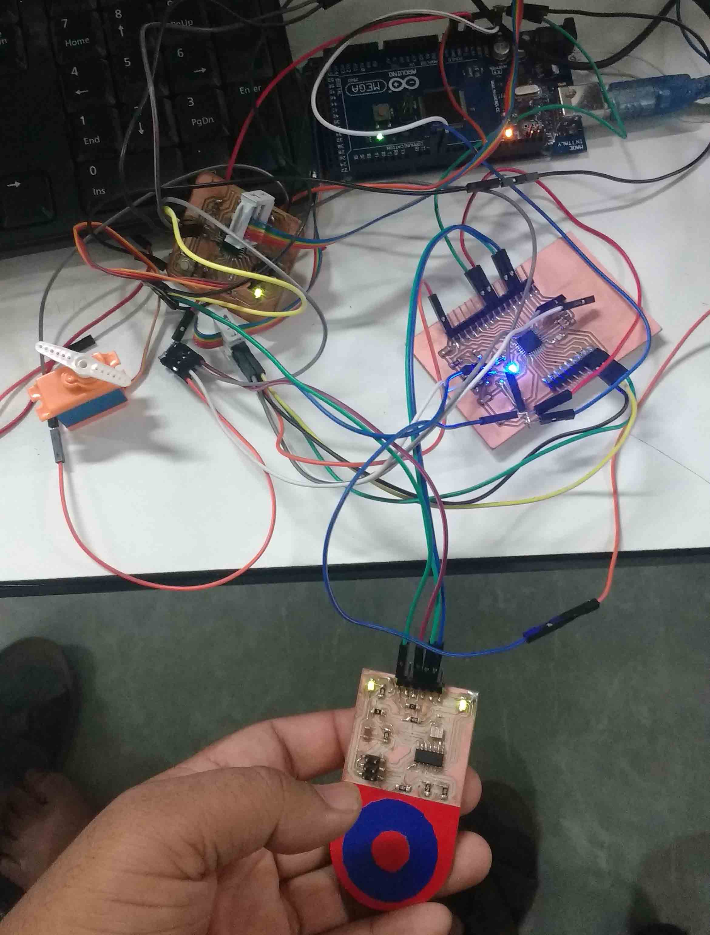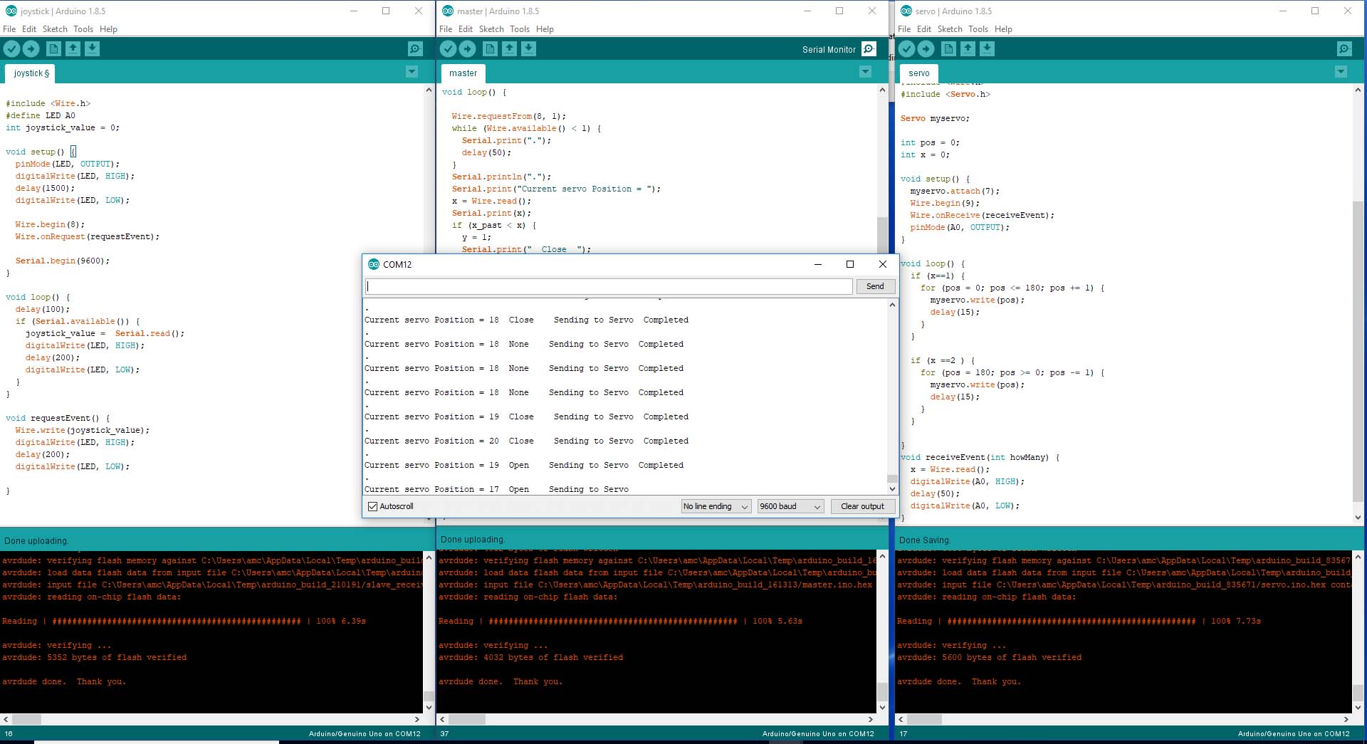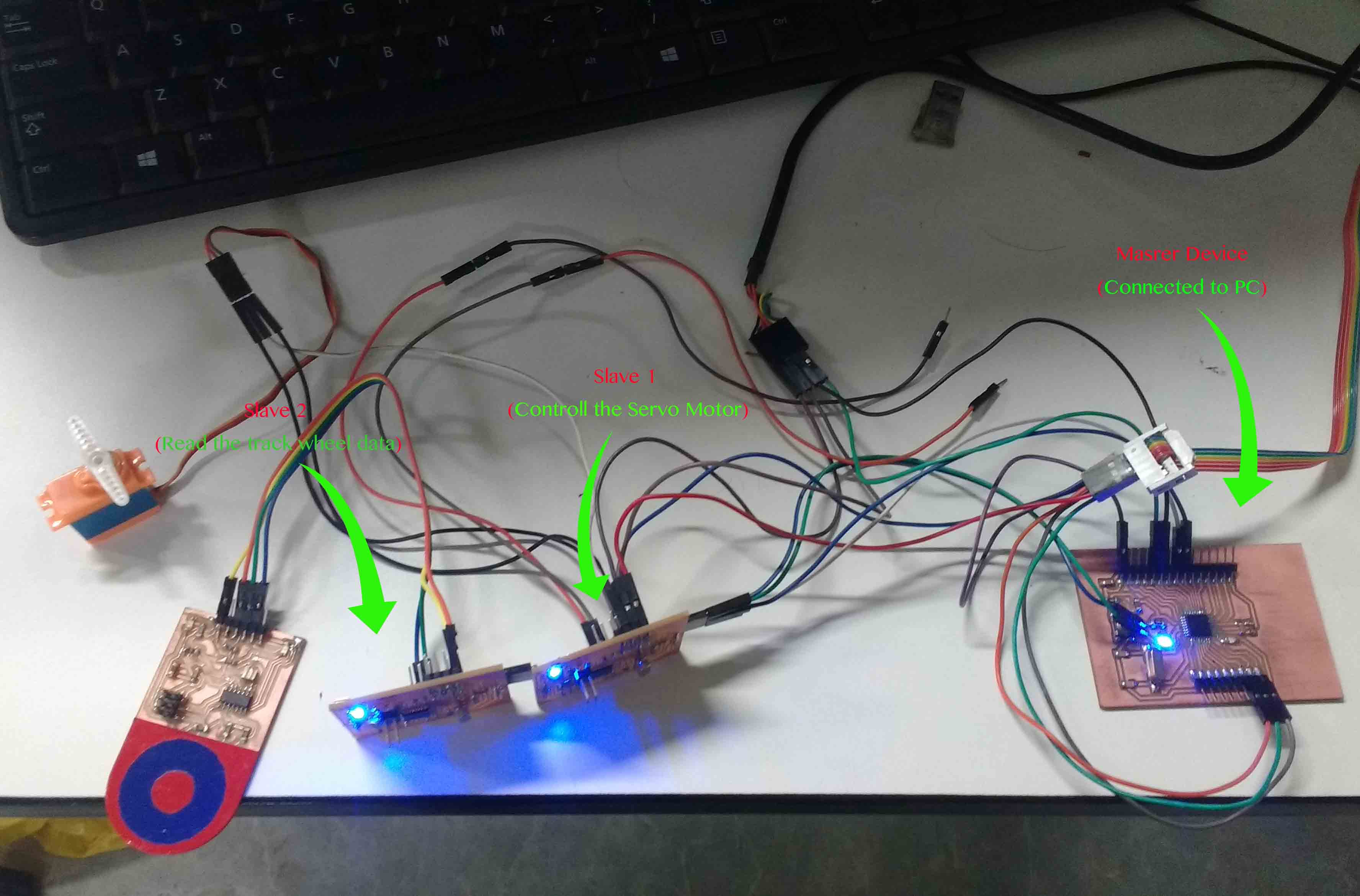 What i wanted to implement is , While I rotate my capacitive scroll wheel which is connected to the 1st MC board the servo motor attached to the second board will rotate also the 3rd board which also serves as the master board wiil send the data to the Pc and will display it .