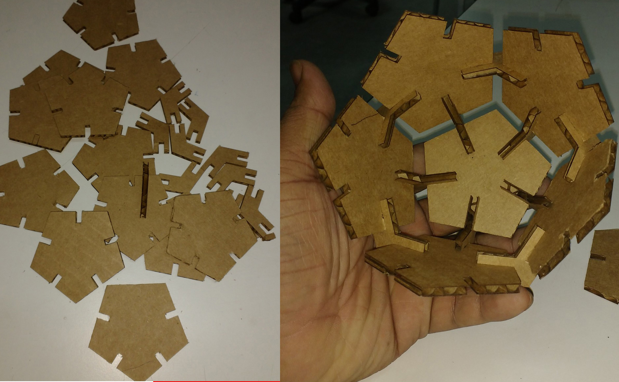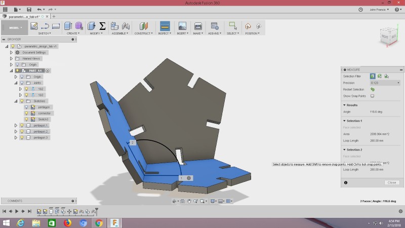 My design consist of 2 shapes a pentagonal build piece and a "L" shaped linking piece.It is much harder to calculate the angle of the "L" shape by manuel calculation. There I found the easynes of a designing software. I cauld easly assemble the components in a 3d space and there after I cauld able to measure the angle between them using Inspect -> measure.