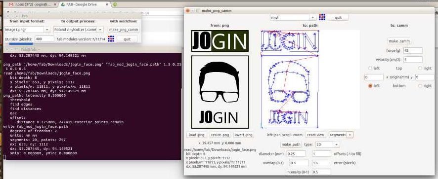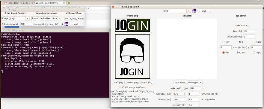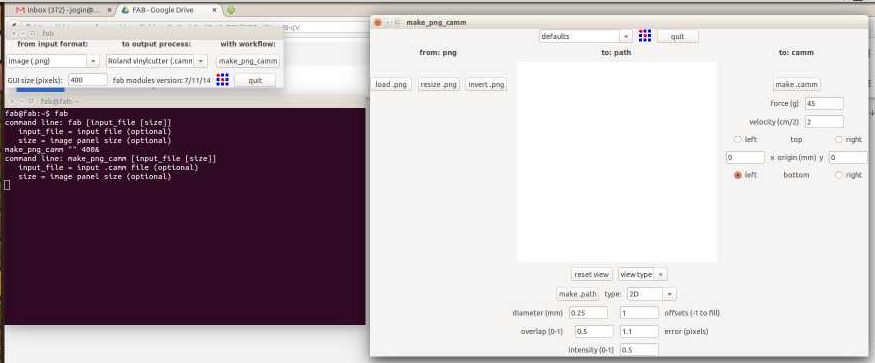 To start a cutting open a terminal and type "fab" .From the window opend select Image(.png) as format and Roland vinyl cutter as process.select "make_png_cam"