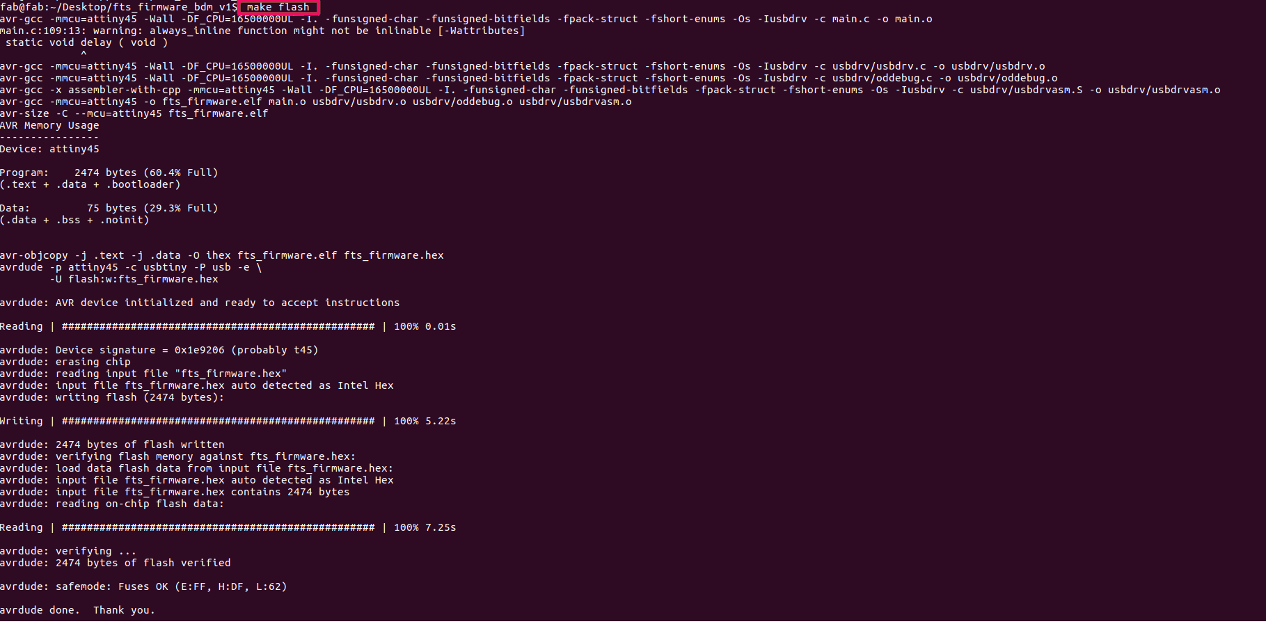 After in the terminal run the command ‘make flash’. This will erase the target chip and program its flash memory with the contents of the .hex file you built before. You should see several progress bars while avrdude erases, programs, and verifies the chip.