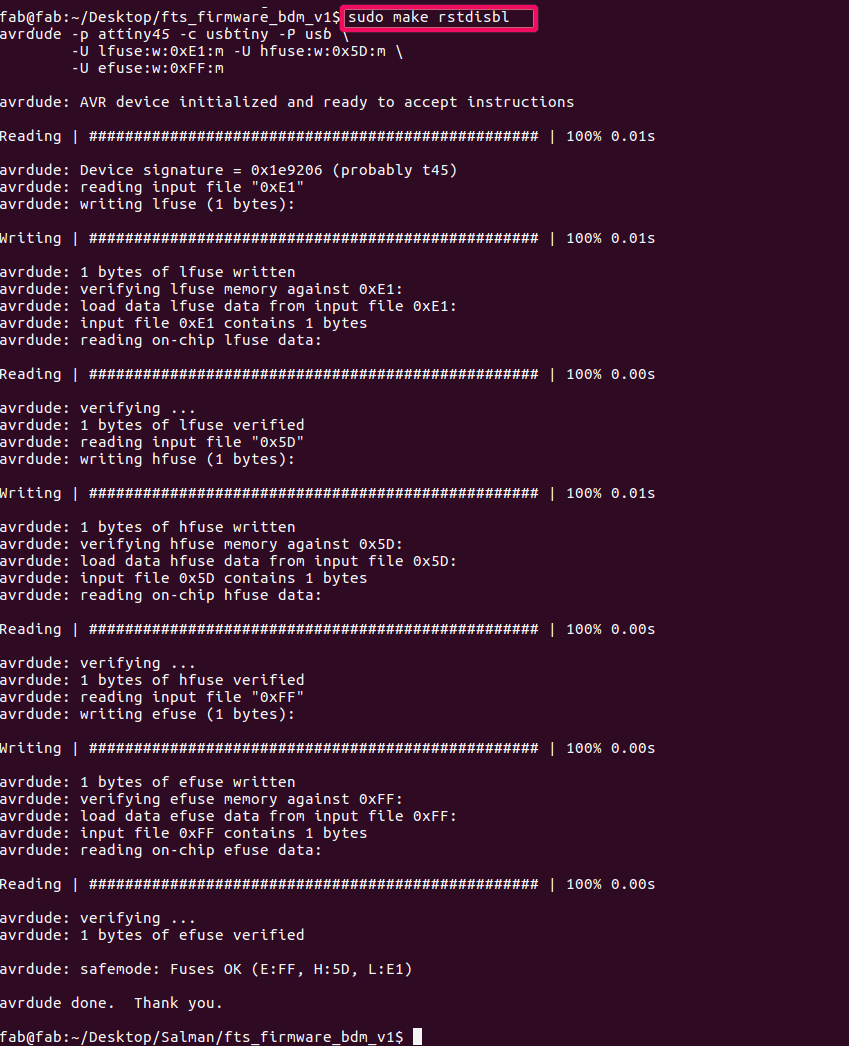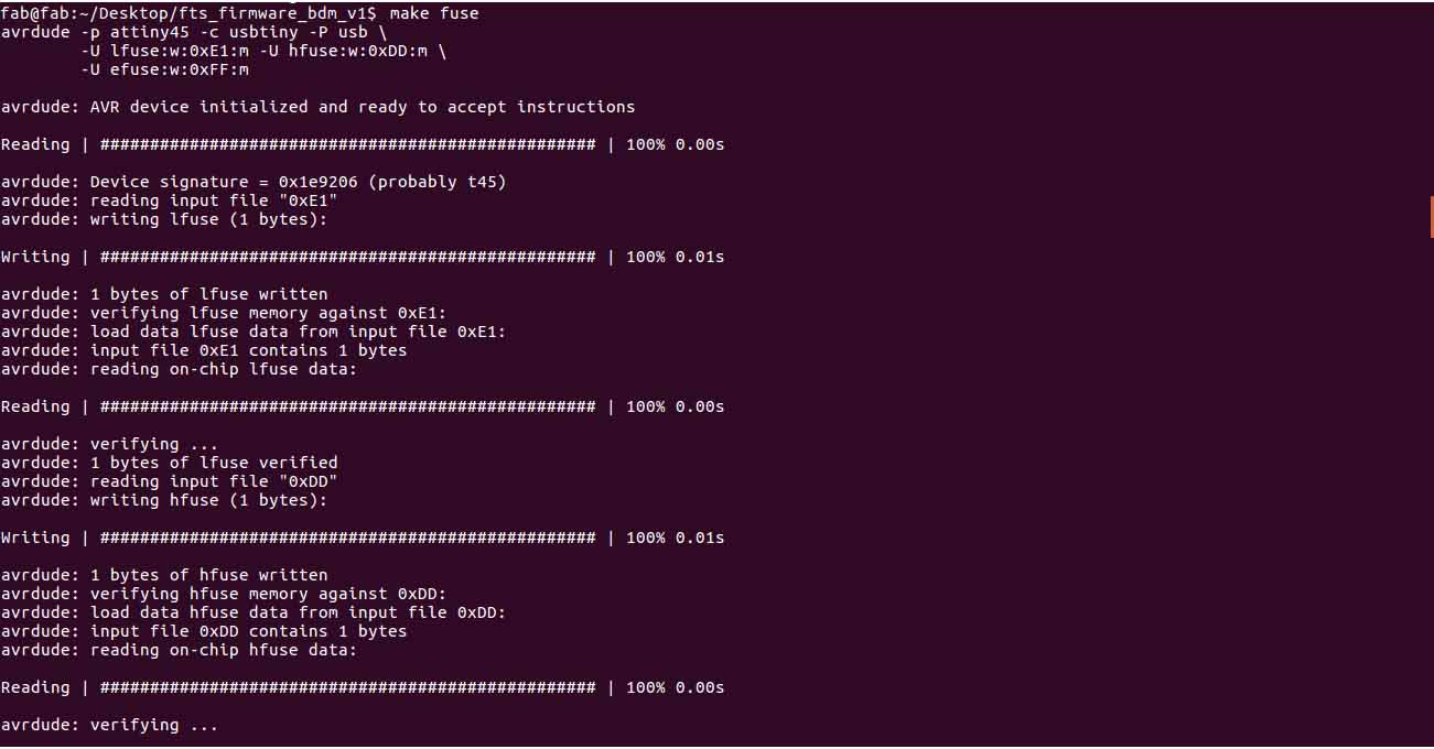 Detailed debugging steps are provided in the FabTinyISP documentation page. Once you've successfully programmed the flash memory, it's time to set the configuration fuses:Go to the terminal and run the make fuses command. This will set up all of the fuses except the one that disables the reset pin.