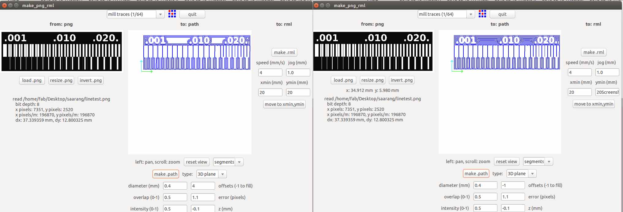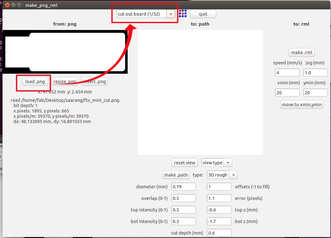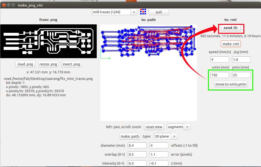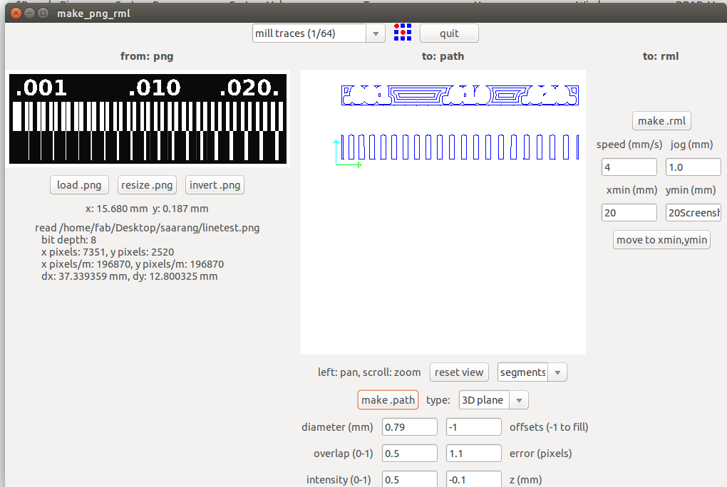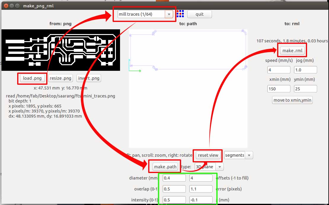 On the top menu select the process you want to use. For milling traces, select the milltraces(1/64) option. Now click load .png to load your traces file and click make path Now you can see the path the tool is going to move through. You can change the setting, I'm leaving it in the defaults. Now if you click make.rml and click send rml