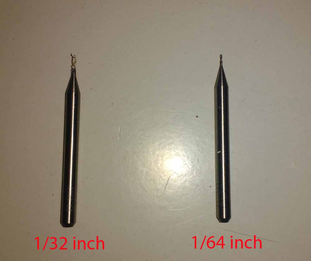 The 1/64 inch is used for tracing and 1/32 inch bit is used for cutting