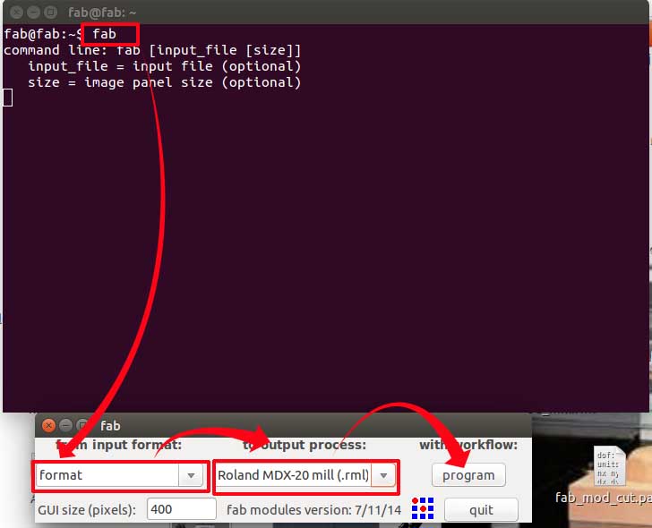 Got to the terminal and run fab Now the fab module will open and the select the input format to .png and select the output you want depending on your machine (modlella MDX 20).