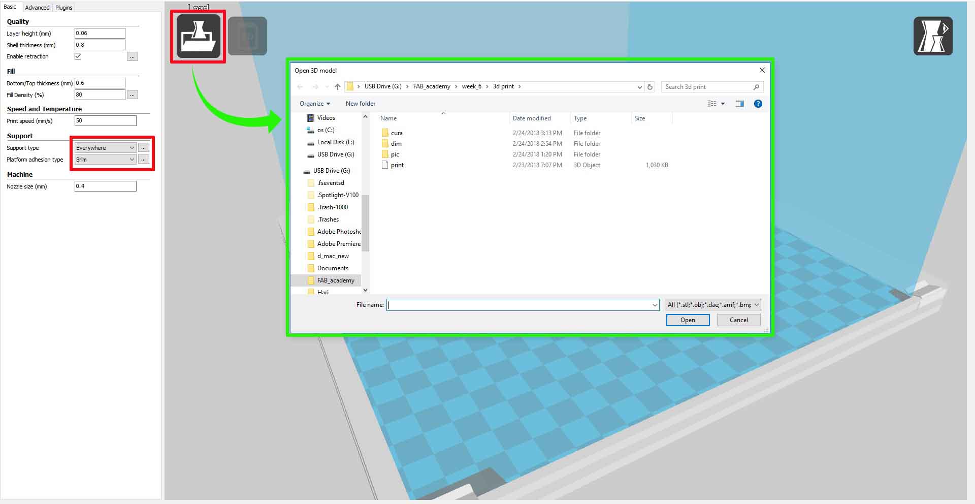 Export the model as stl to the local system.I used ultimaker to print my scaled down model.I used Infill 50% ,layer height 0.1 mm and 0.1 print speed .I enabled support and Build Plate Adhesion.