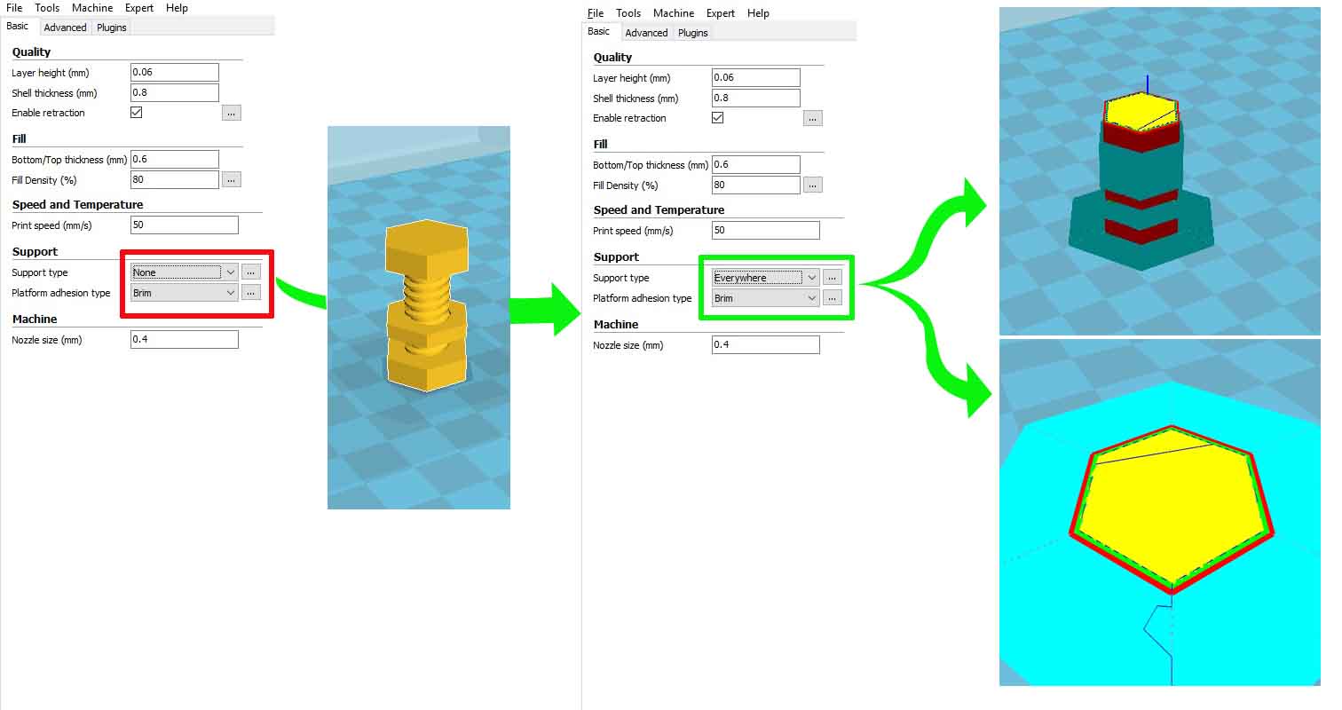 I found that our ultimaker version uses the same material for suppot as well as for building .So it will be difficuls for me to clear and also for seperating my double headed nut and bolt structure.