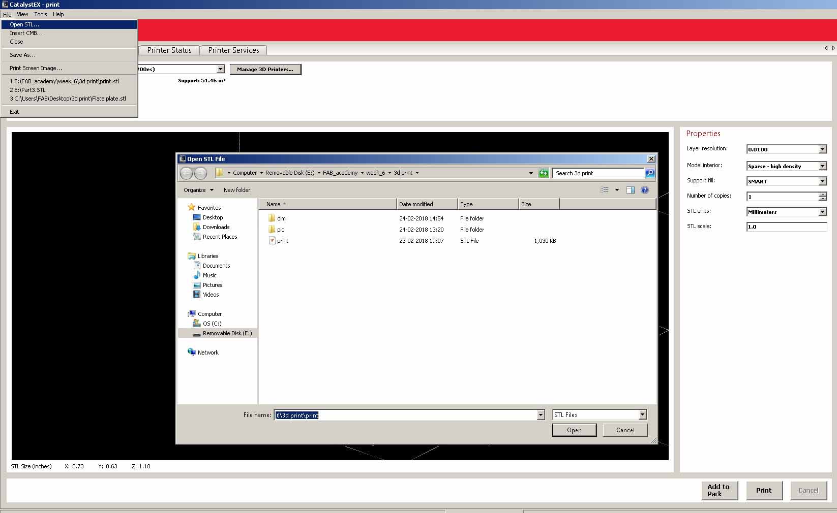Selet the type of material support material,number of copies,units etc.Since I am printing a small model and it need to be strong I choose "Sparse - high density" As moedel interior ,0.0100 as layer resolution and "SMART" support.