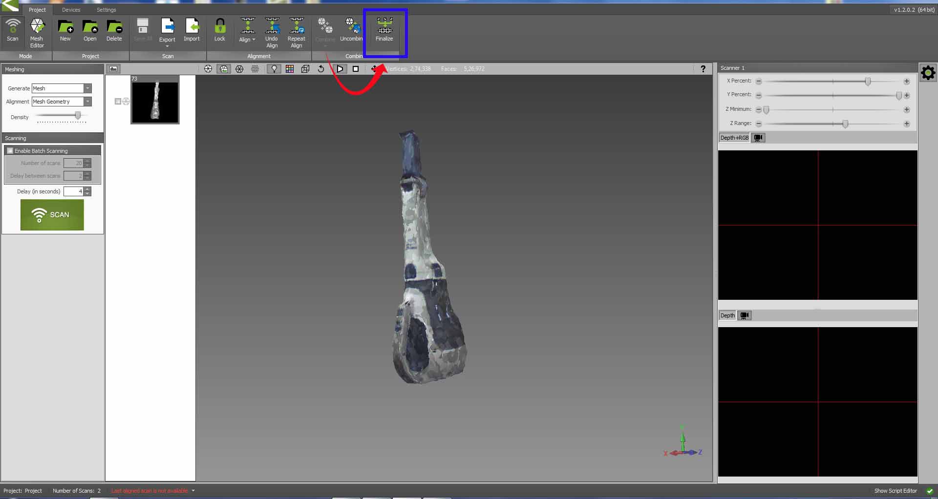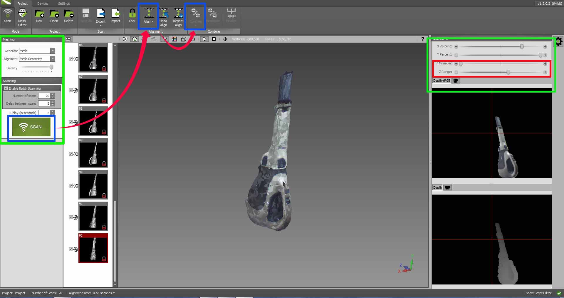 After completing the align press the combile button this will combile all the individual scans in to a single model