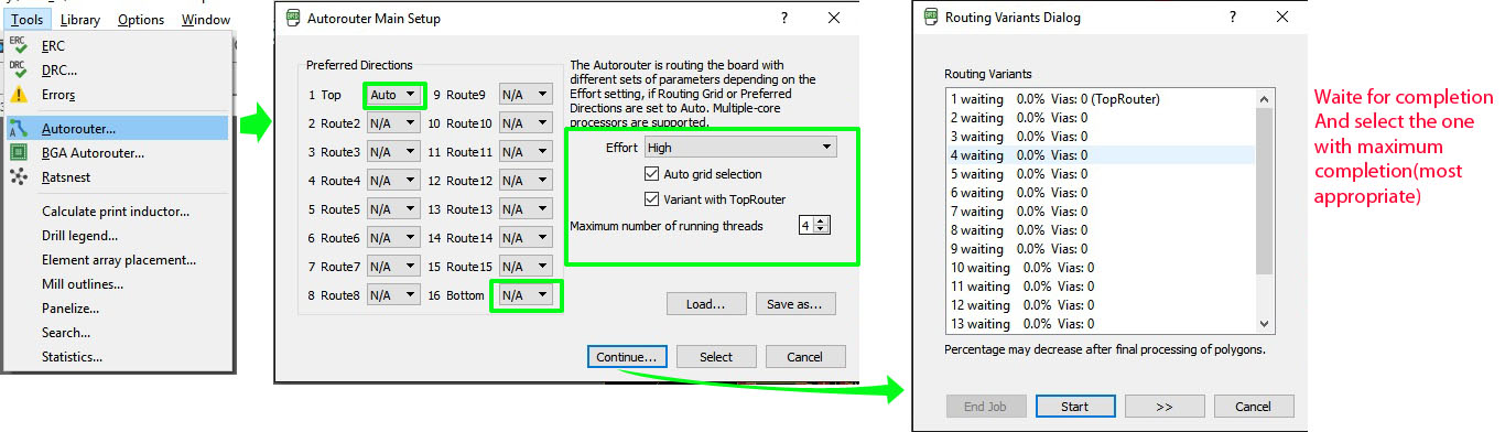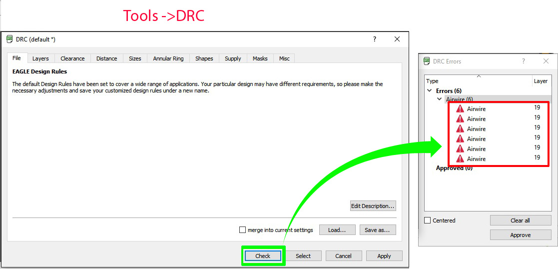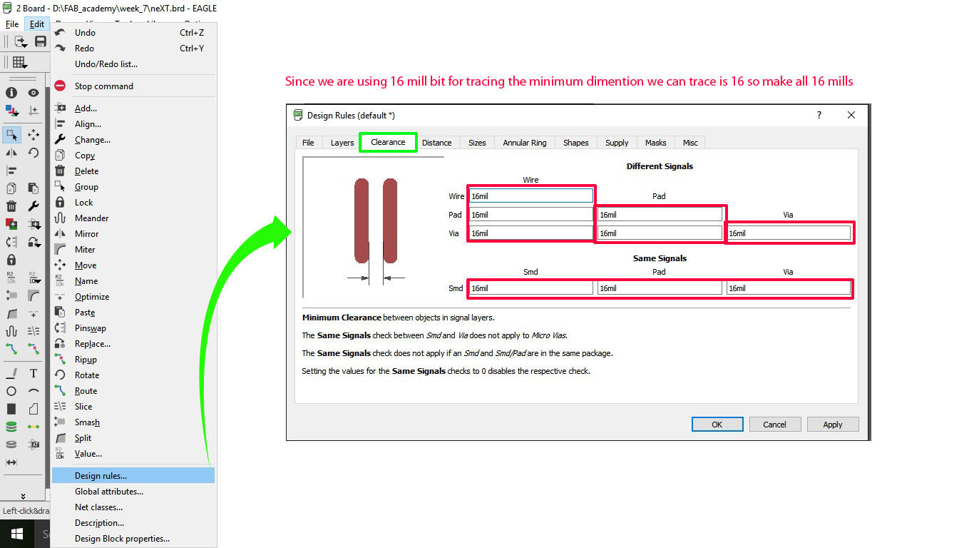 Befor autorouting we have to set our design rools.Set all the clearences to 16 mill this is bacause we are using 16 mills milling bit if you are using another bit you have to vary this.