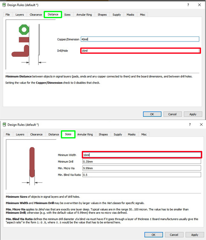 Under Distance change "drill hole" and "Copper/dimension" sze to 16 mills.