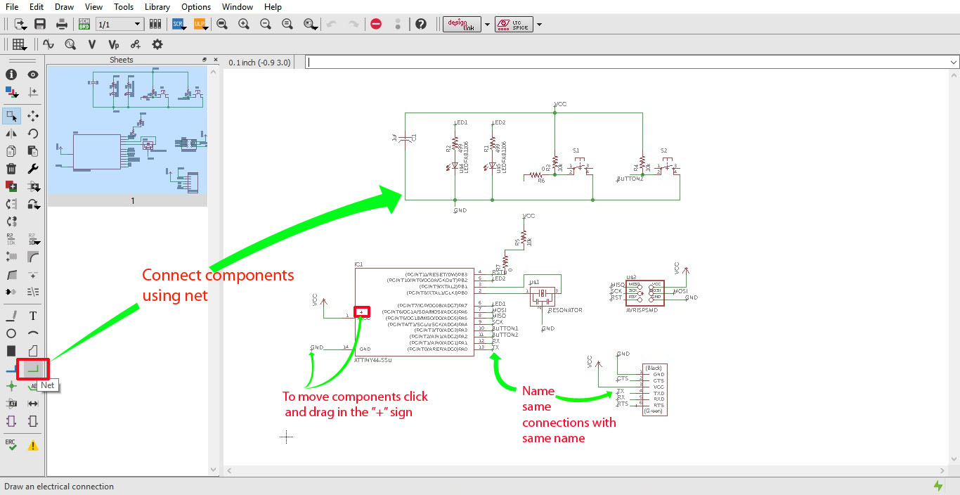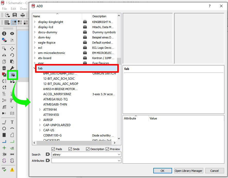 To add a new component to the schematic Select the add icon in the tool bar and choose the fab library