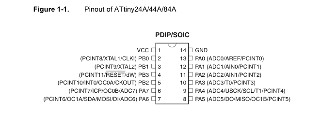 The ATtiny44 is a high-performance, low-power Microchip AVR RISC-based CMOS 8-bit microcontroller.It combines 4KB ISP flash memory, 256-Byte EEPROM, 256B SRAM, 12 general purpose I/O lines .The ATtiny44 consistof 32 general purpose working registers, an 8-bit timer/counter with two PWM channels, a 16-bit timer/counter with two PWM channels, internal and external interrupts, an 8-channel 10-bit A/D converter and a programmable gain stage (1x, 20x) for 12 differential ADC channel pairs. It has a programmable watchdog timer with internal oscillator.The a internal calibrated oscillator and three software selectable power saving modes makes it suitable for small embedded products . By executing powerful instructions in a single clock cycle the device achieves throughputs approaching 1 MIPS per MHz .It also balance power consumption and improve processing speed.