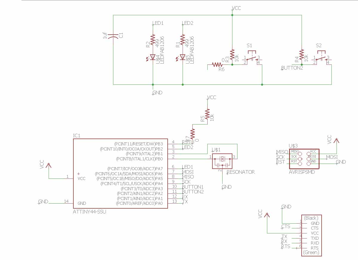 We are using the USBtiny programmer we made during the Week 5 assignment for programming our board. The ISP Programming of ATtiny 44 using six pins .These are the 6 pins.