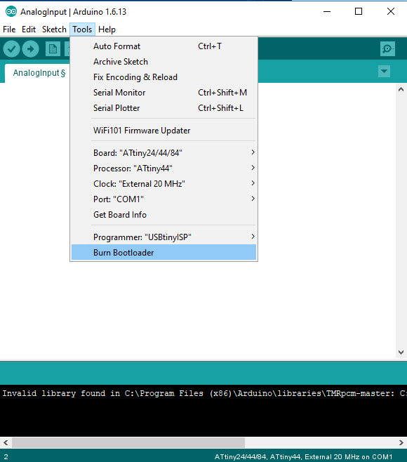 Remark! ATTiny44 is defaultly set to use the Internal clock .So if you are using Arduino to program it. It will not get program initially . We have to upload the Bootloader first.