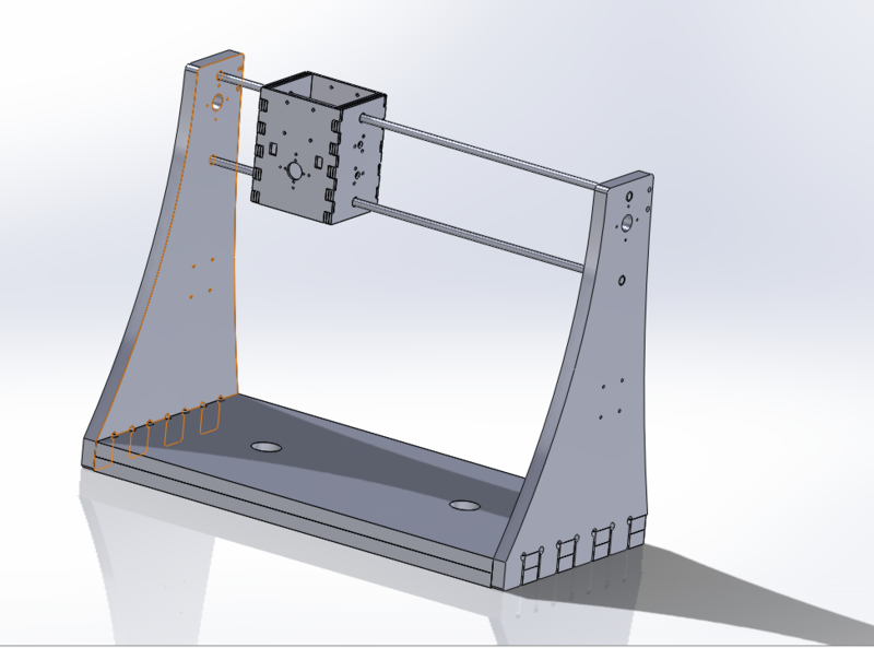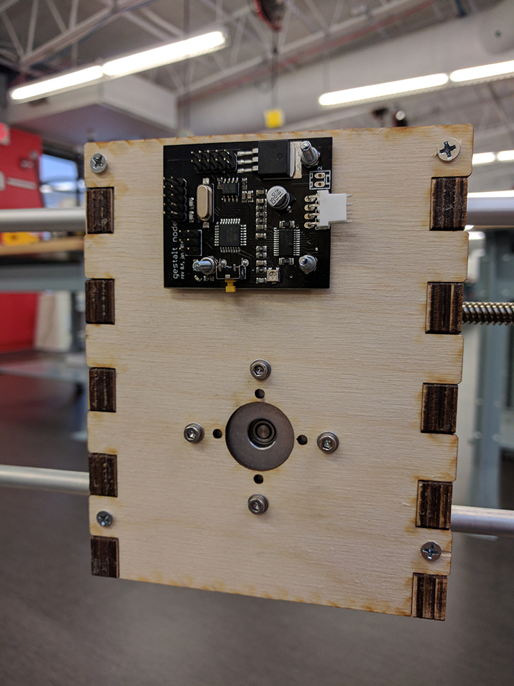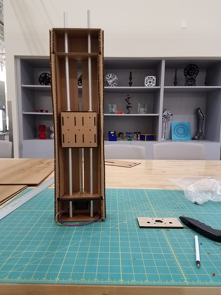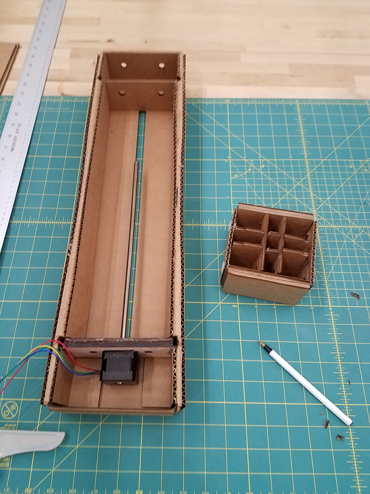 Once I finished folding all the scored flaps, gluing things together, and attaching all the hardware, we had one axis finished and moving smoothly.
