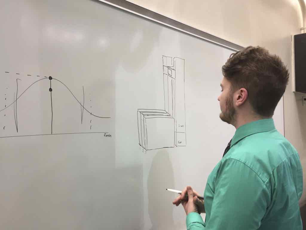 After showing him around the lab, we got to work figuring out how to build a simple candle making machine. Arriving with a cardboard mock-up of a motorized axis, and assuming that is a component we are going to make and use in our design we begin planning out how to best make the machine and minimize preventable errors caused by things like slippage, misalignment, etc.