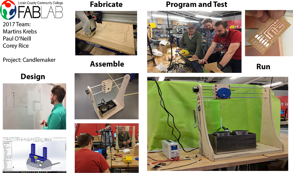 After we got the motors to run, and the program working, it was getting very late at night. We managed to get the machine to make a couple thin candles (a few dips of build-up) Paul and I left Corey to finish up with the software and come back the next day.