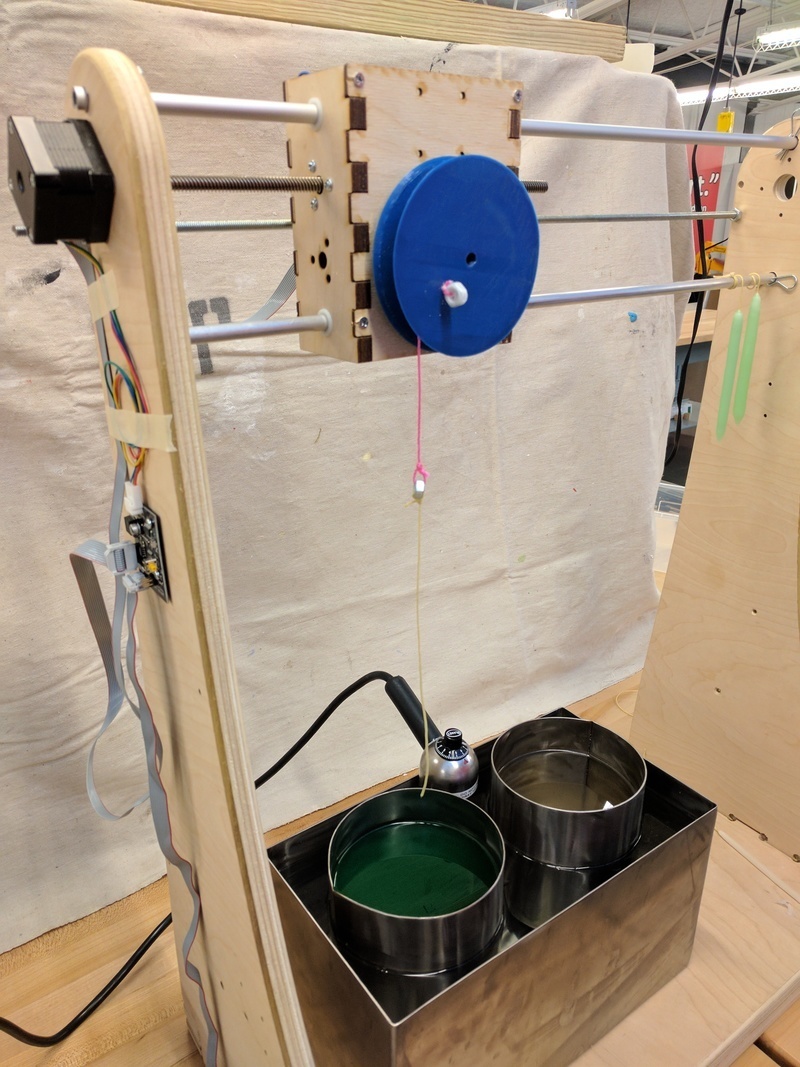 I was able to push that me build the main structure/frame out of wood and Cory had a great idea of using a pully to dip the end of the wick in and out of the wax in each pot.