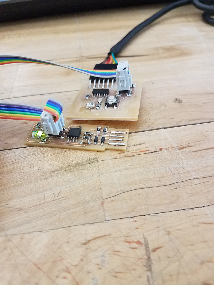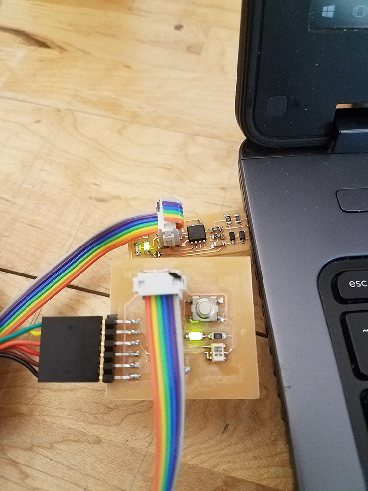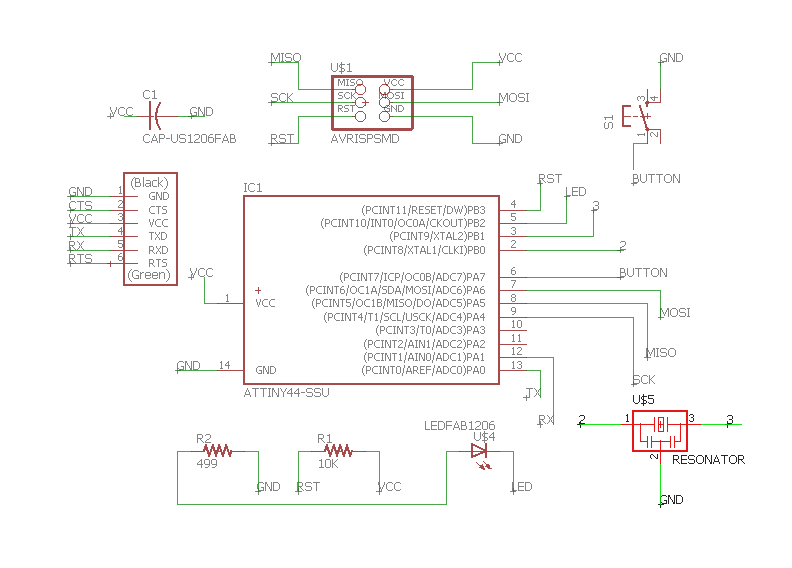 Once I have added all my components (ATtiny44, 6 Pin heads, Resonator, Capastior, LEDs, Resistors, and a Button), We start drawing and labeling the connections and allowing the program to "connect" them when prompted.