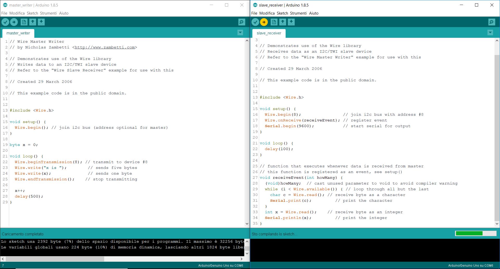 To understand the protocol, during the lesson I started with a very easy setup and examples, I used an Arduino UNO as a master and an Arduino Nano as a slave.