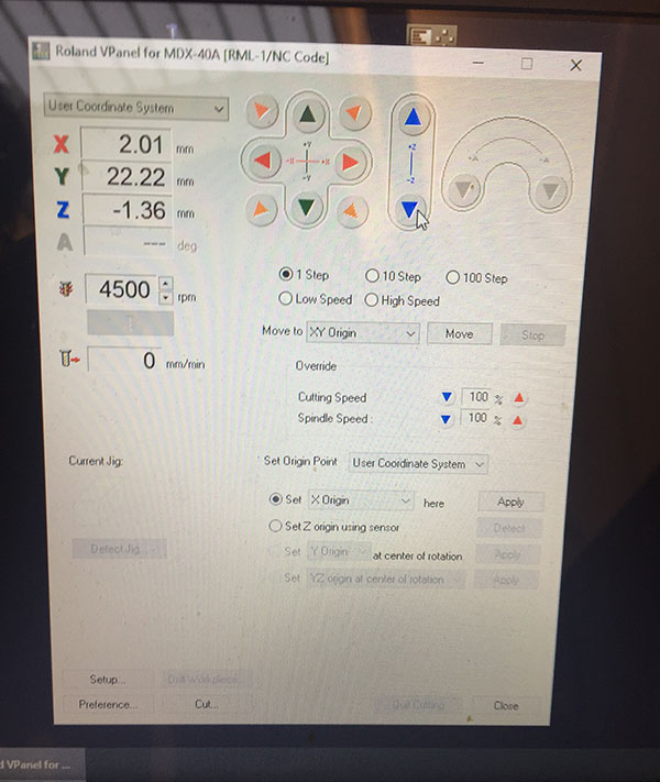 After we select MDX-40 Machine. We left the positions of the axis unchanged because I preferred to manage them directly in the cutter software.