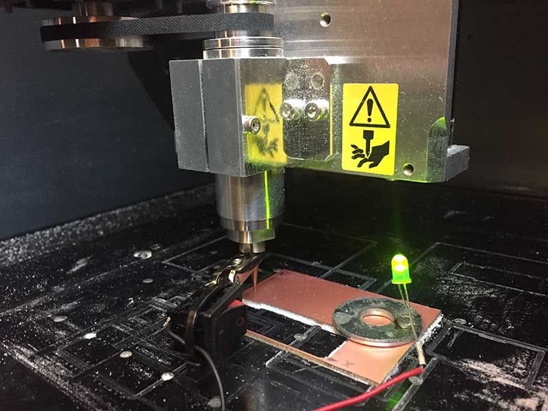 A cleaver trick, available at Opendot: you positioning the magnet of this tool on the end mill: when the tool touches the copper, the circuit closes and the LED lights on!