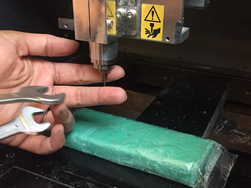 Then we mount the 0,4 mm end mill: we put piece of clay under the spindle for