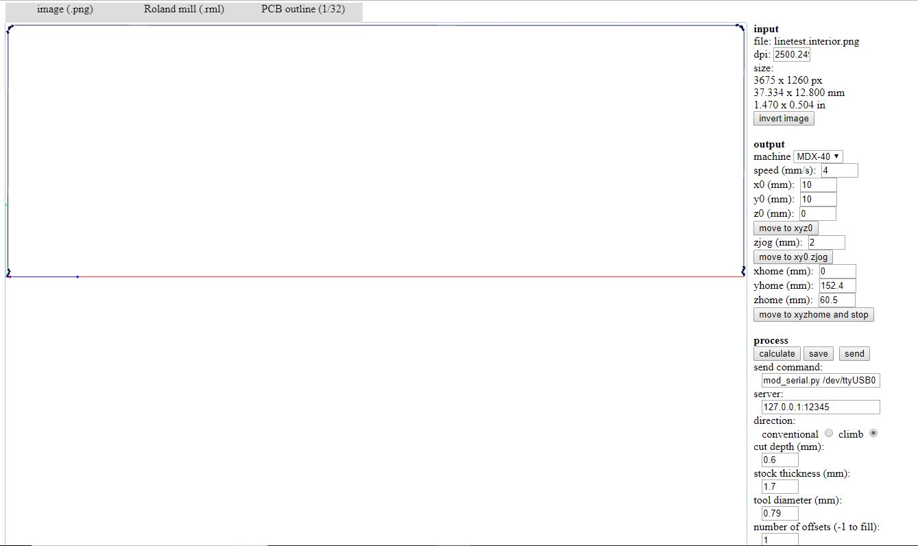 Select MDX-40 machine, 4m/s as speed and 0.6 as cut depth, diameter of the tool: 0.69 mm and 1 offset. Then calculate, verirfy that it is correct and save on UBS pen.