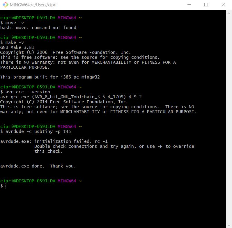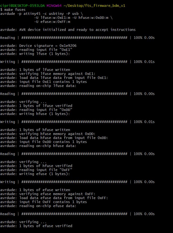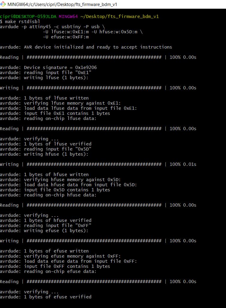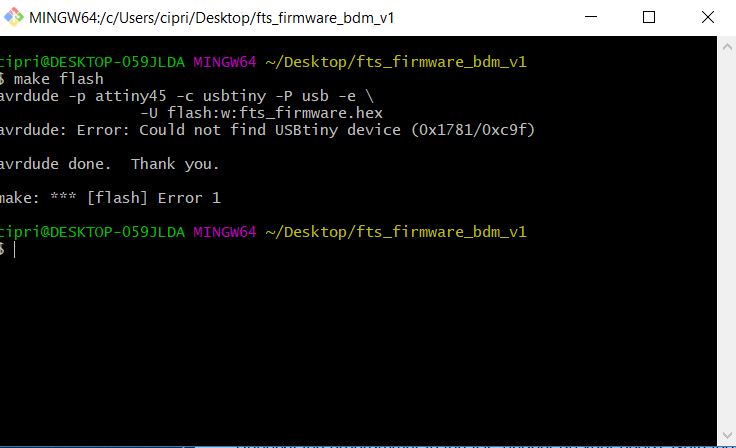 Th last step befor programming is to Build the Firmware, generate the firmware.hex file. It is very simple because you downloaded from tutorial the zip folder, estract all the file and open in git (right click: git bash here on the unzip folder) and then run the command "make". This will build the hex file that will get programmed onto the ATtiny45. When the command completes, you should now have a file called fts_firmware.hex.