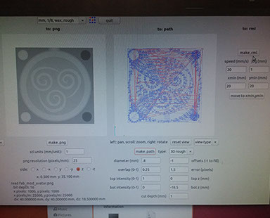 The parameters I used where 20 mm/s for speed, 1 mm for jog, 0.8 mm diameter of the tool, -1 for offsets, 0.25 overlap, 1.5 pixels, 1 top intensity, 0 mm top z, 0 bot intensity, -18.5 mm bot z and 1 mm for cut depth.