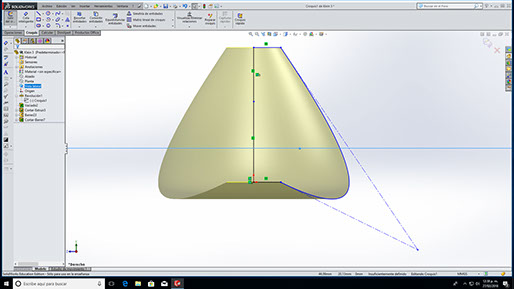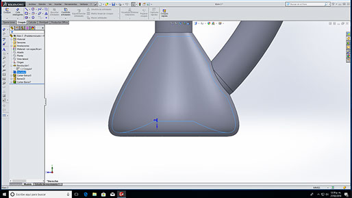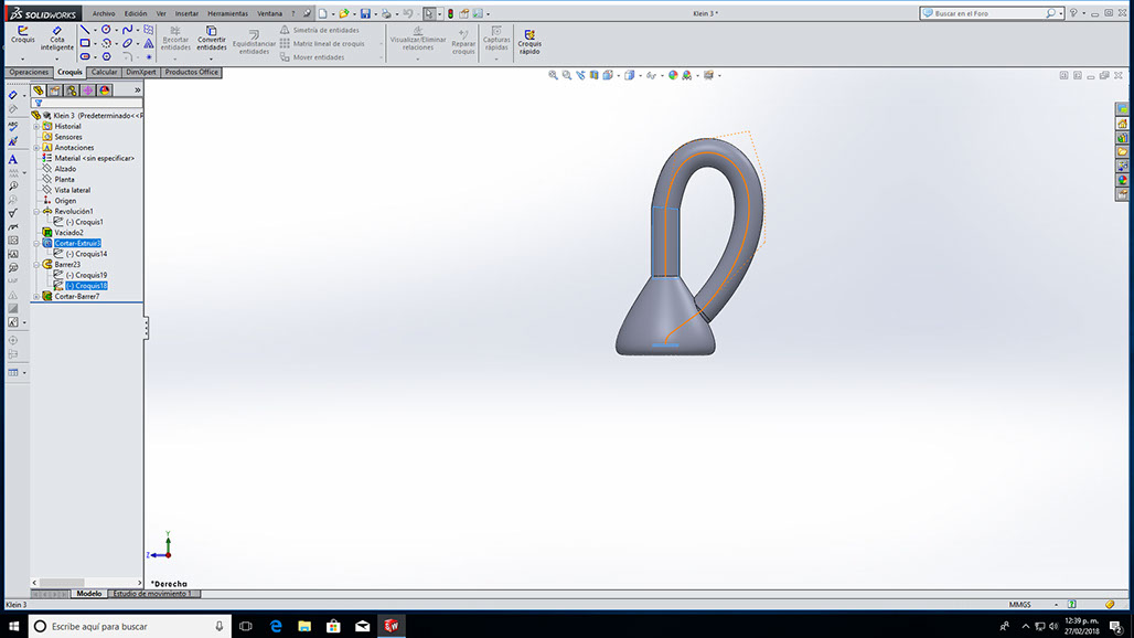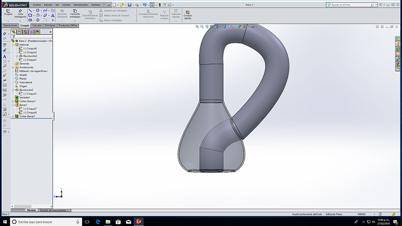 To begin this part of the assignment I had to think of something that was not easily made by using an automatic cutting machine. I like the YouTube channel Numberphile, that channel has several videos on Klein bottles, so I decided it would be a good idea to make one, since I could not see a way to make one without doing it by had or by 3D printing it. To begin with my design I entered SolidWorks and created a new piece. I made a drawing in which I roughly wanted the Klein bottle to be and i made a revolution extrusion with it. I then proceeded to empty the solid I created and cut the neck part and entrance part of it. I then created two circles, and the shape of the neck of the bottle as a path, I extruded the wider circle along the path, and then cut with the smaller circle along the same path. It roughly ended being something like this. Note this is a recent screenshot, mainly because I forgot to take them along the whole process.