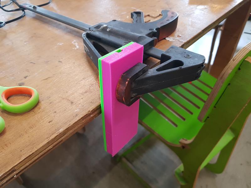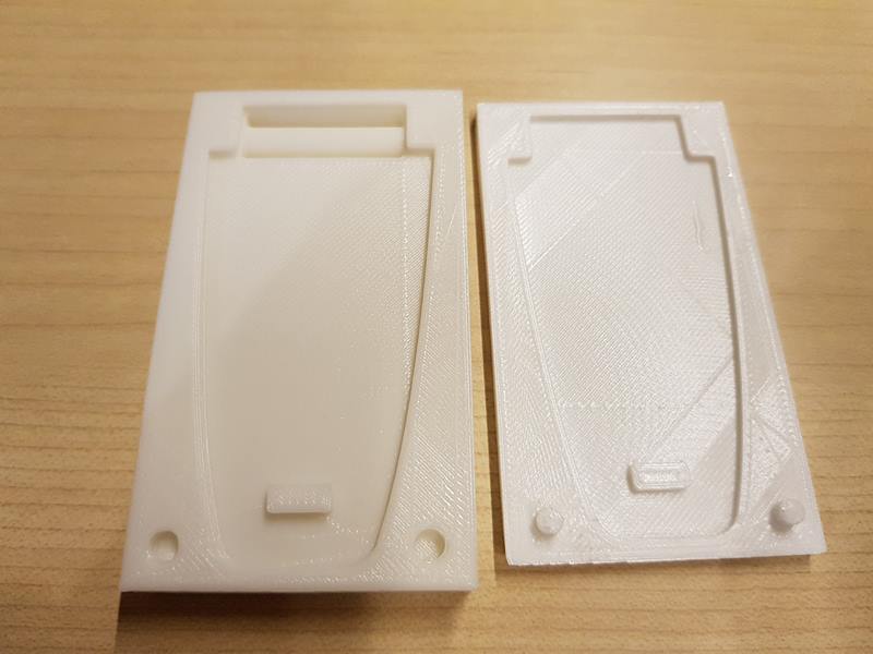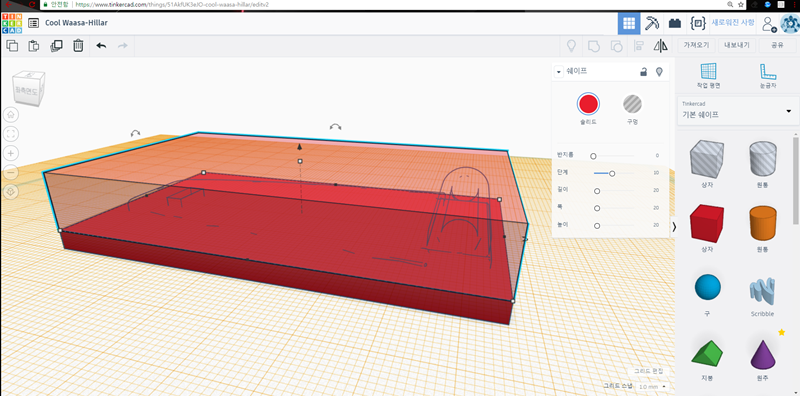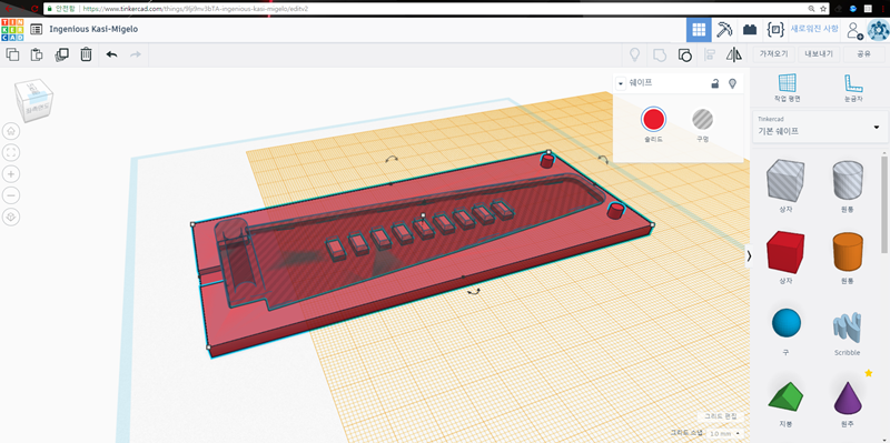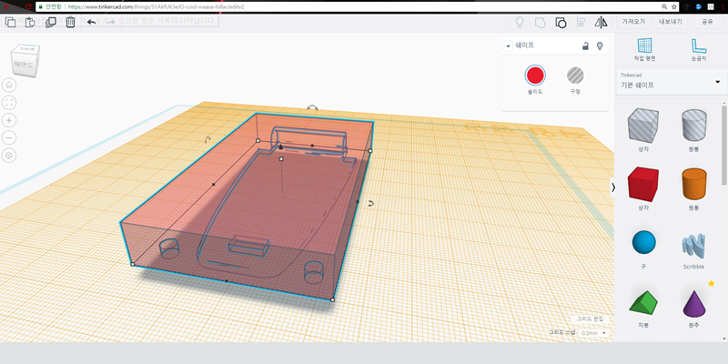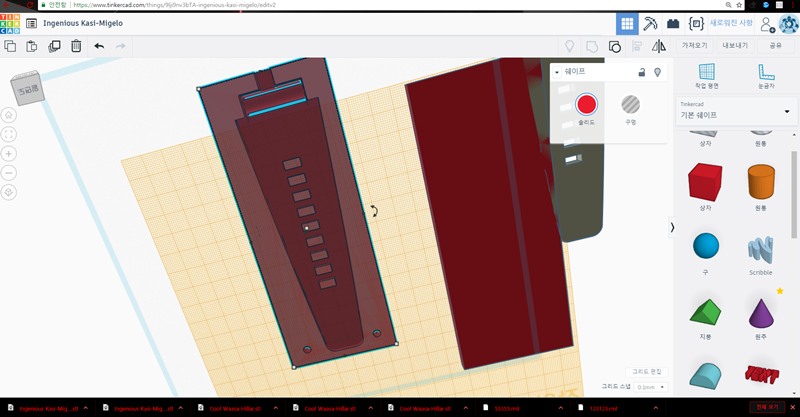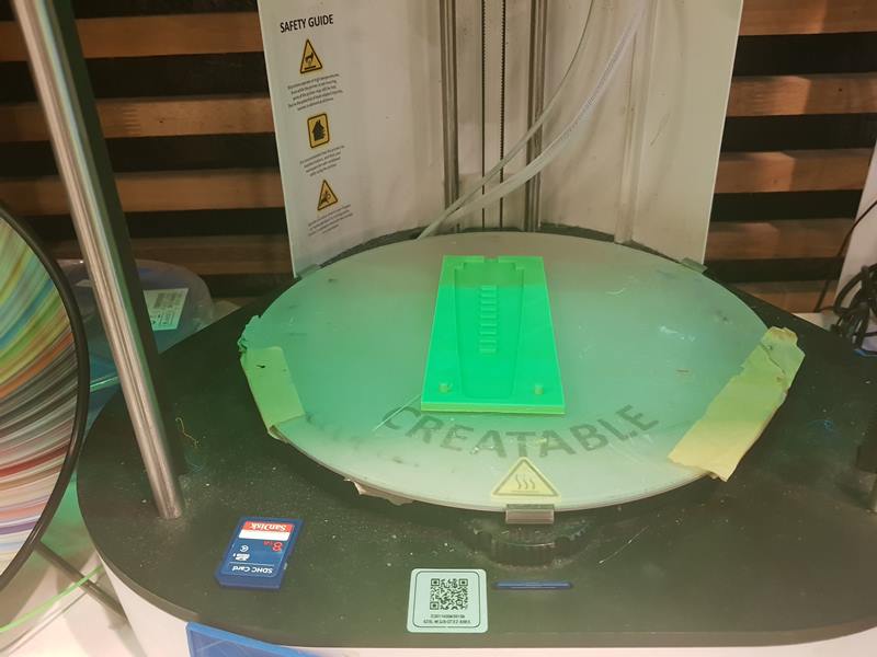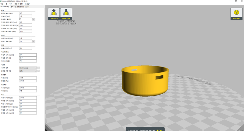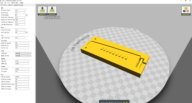 Power : 60 % (150 w) 3D modeling design through fusion 360. Then, I called stl file to tinkercad and did mold design. And I had used a 3D printer in Fablab Seoul with Creatable D3. It was printed well on the floor. I completed the mold with a 3D printer. It was fixed using a clamp because it is not flat when printed on a 3D printer. And It couldn't make an entrance for silicon because I had a mistake in design.