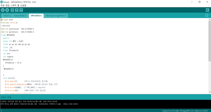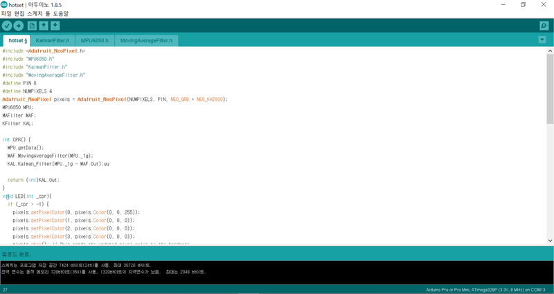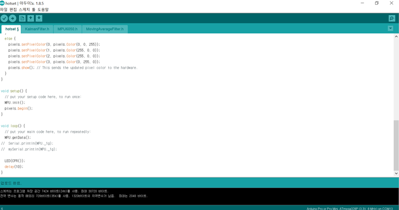 I made a coding for the Neo pixel and acceleration sensor. The library was downloaded using the MPU 6090 as acceleration sensor. However, there was a problem where sensors of acceleration had high errors and suddenly produced high numbers. So I made an algorithm to catch the error of the acceleration sensor.