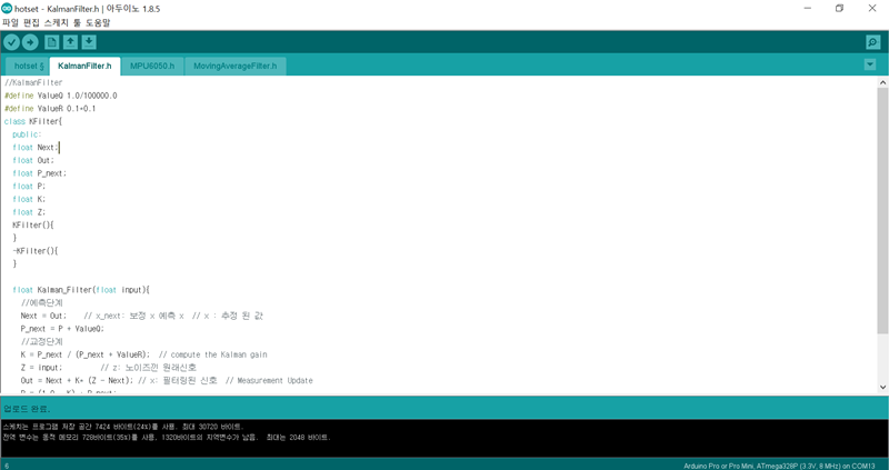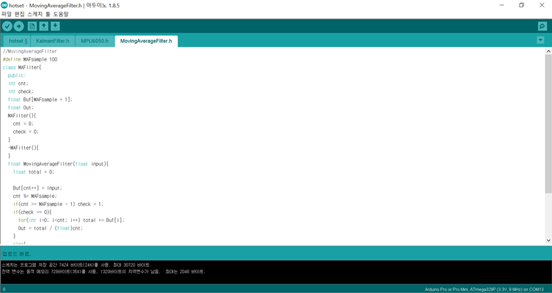 Using the Kalman filter, check the acceleration sensor for error. Then I added another average filter to calculate the mean of the movements. I operated the acceleration sensor and the neo-pixels with the arduino.