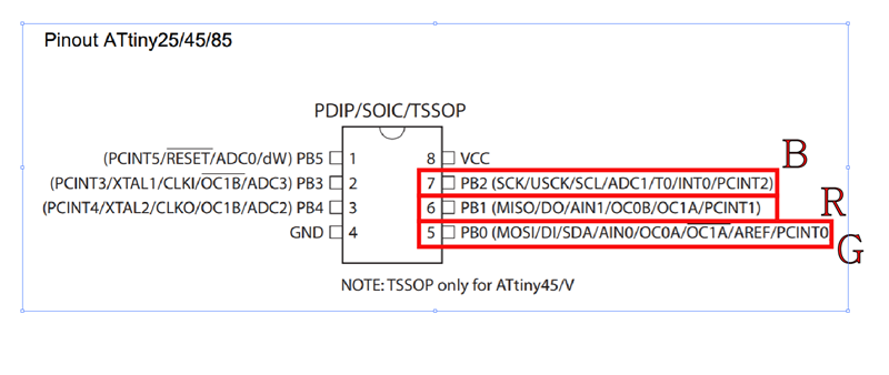 So I painted a schematic again. And I changed R and B in rgb schematic because they are different locations. The pinout diagram on attiny 45 shows the position of the RBG pin. Only one color can be adjusted with a pin.